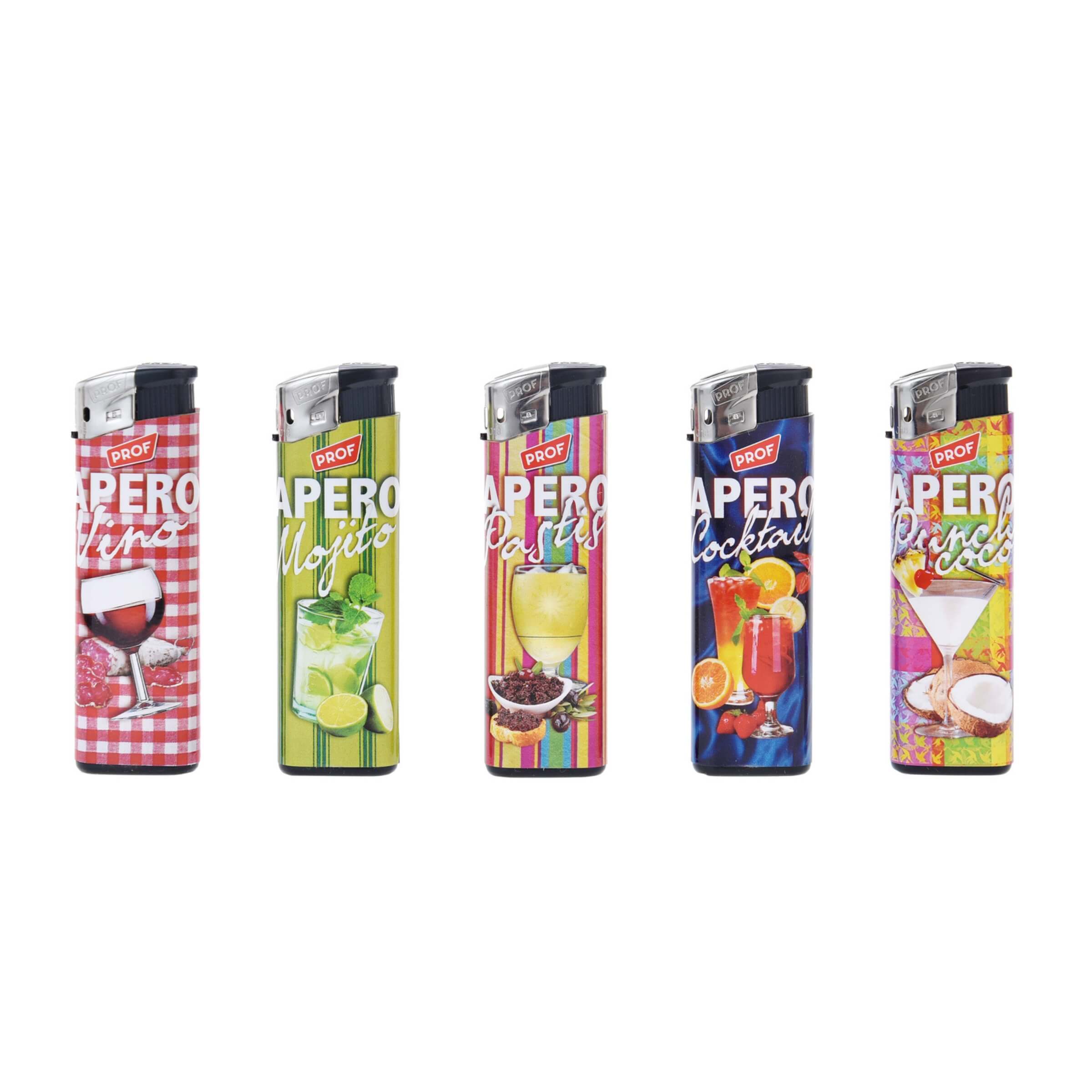 Gli accendini PROF Apero offrono un tocco di stile e funzionalità in un design ispirato agli aperitivi. Questi accendini sono perfetti per l'uso quotidiano, con una qualità affidabile e duratura.• Design Tematico Apero: Ogni accendino presenta un design vivace e colorato, ispirato ai vari tipi di aperitivi, come vino, mojito, cocktail e altro. I motivi accattivanti rendono questi accendini unici e perfetti per aggiungere un tocco di personalità alla tua routine quotidiana.• Confezione da 50 Pezzi: Gli accendini sono venduti in una pratica confezione da 50 pezzi, ideale per la vendita al dettaglio o per garantire una scorta a lungo termine. L'espositore in cartone facilita l'organizzazione e l'esposizione nei punti vendita.• Dimensioni Compatte: Con dimensioni di 8.1 cm di altezza, 2.45 cm di larghezza e 1.15 cm di spessore, gli accendini PROF sono facilmente trasportabili e comodi da utilizzare. La loro forma compatta li rende perfetti per essere riposti in tasca o in borsa.• Peso Leggero: Ogni accendino pesa solo 0.017 kg, rendendoli estremamente leggeri e facili da maneggiare. Il peso ridotto non compromette la robustezza e la qualità del prodotto.• Affidabilità e Sicurezza: Gli accendini PROF sono progettati per essere sicuri e affidabili, con un meccanismo di accensione che garantisce una fiamma costante. Sono conformi agli standard di sicurezza europei, garantendo un utilizzo sicuro per tutti.Gli accendini PROF Apero combinano funzionalità e design tematico, offrendo un prodotto di alta qualità ideale per uso personale o per la vendita al dettaglio. Con la loro confezione pratica e i motivi accattivanti, questi accendini sono un'ottima scelta per chi cerca un accessorio pratico e stiloso.