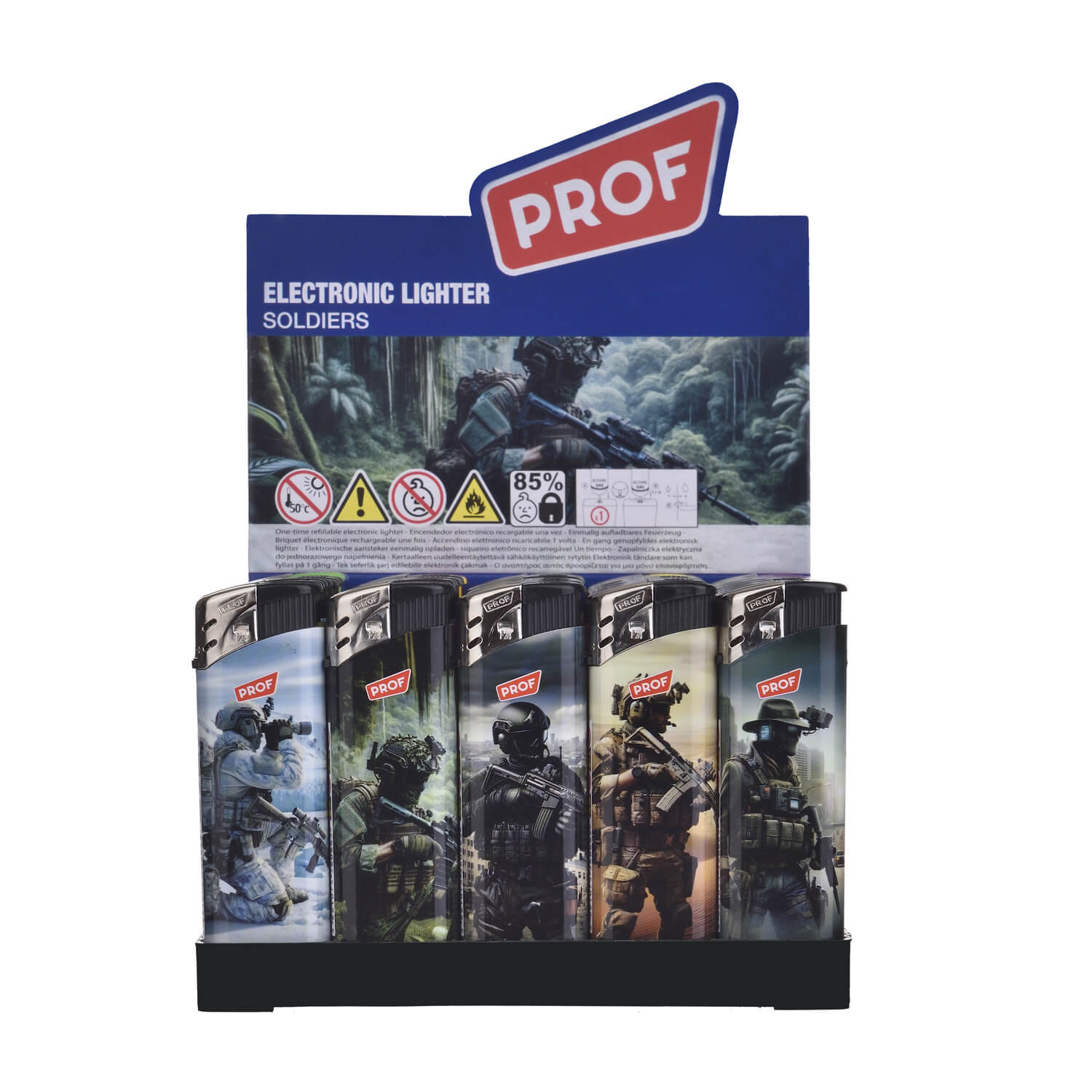 Gli accendini Prof Soldiers uniscono praticità, affidabilità e un design grintoso ispirato al mondo militare. Questa collezione si distingue per le grafiche a tema soldati, raffiguranti figure in azione e scenari realistici che donano agli accendini un aspetto deciso e carismatico, perfetto per chi ama articoli dal carattere forte e distintivo. Confezionati in un espositore da 50 pezzi assortiti, rappresentano una scelta ideale per tabaccherie, bar e rivenditori che vogliono offrire ai propri clienti un prodotto funzionale ma anche accattivante sul piano estetico.Gli accendini Prof sono dotati di tecnologia piezoelettrica, che consente un’accensione elettronica sicura e immediata, senza bisogno di pietrine. La fiamma fissa garantisce stabilità e costanza nell’utilizzo, mentre la carica del serbatoio al 85% assicura una lunga durata e numerose accensioni. Resistenti e progettati per un utilizzo quotidiano, uniscono praticità e design in un articolo pensato per rispondere alle esigenze di un pubblico moderno e dinamico.• Design tematico: Stampe dedicate al mondo militare, con grafiche Soldiers in varie ambientazioni, che rendono ogni accendino unico e di forte impatto visivo.• Tecnologia piezoelettrica: Sistema di accensione elettronico che elimina l’uso di pietrine, offrendo sicurezza e semplicità.• Fiamma fissa: Accensione stabile e uniforme per un utilizzo pratico e affidabile in ogni occasione.• Espositore da 50 pezzi: Confezione completa, perfetta per la rivendita al dettaglio, con assortimento di diverse grafiche Soldiers.• Sicurezza garantita: Prodotto realizzato secondo le normative europee di sicurezza, con materiali di qualità e controlli accurati.• Versatilità: Ideali per tabaccherie, punti vendita di articoli da regalo, bar e negozi che cercano prodotti pratici e dal forte appeal visivo.Gli accendini Prof Soldiers sono molto più che semplici strumenti di uso quotidiano: rappresentano un accessorio di tendenza che abbina funzionalità, lunga durata e un design che non passa inosservato. Perfetti per chi desidera distinguersi con un oggetto pratico e al tempo stesso espressivo.