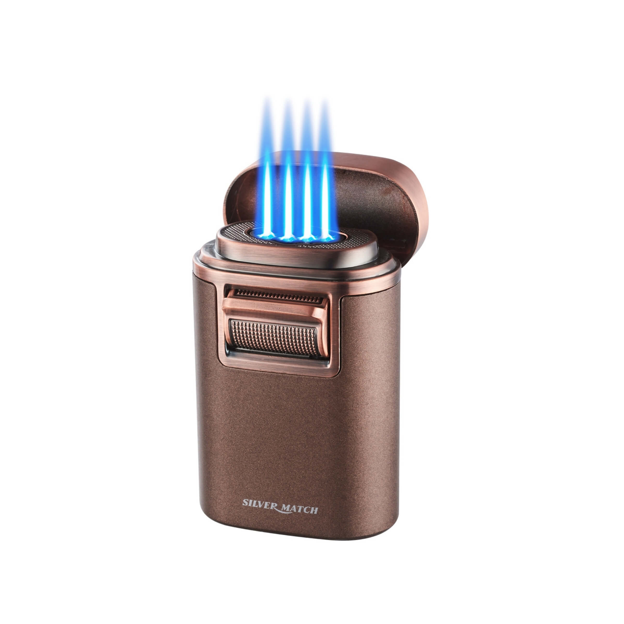 L’accendino Silver Match Monaco a quadrupla fiamma è un accessorio elegante e ad alte prestazioni, progettato per chi ricerca potenza, precisione e raffinatezza in un unico strumento. Realizzato con materiali di qualità e una cura artigianale dei dettagli, combina il fascino del design contemporaneo con la funzionalità avanzata della tecnologia a gas butano. La sua struttura solida e il colore rame satinato con finiture metalliche donano un aspetto sofisticato, ideale per accompagnare ogni momento di piacere legato al fumo, in particolare per gli amanti dei sigari.• Quadrupla fiamma jet: Il sistema di accensione a quattro getti assicura una fiamma potente, stabile e uniforme, perfetta per accendere sigari o tabacchi pregiati in modo rapido e omogeneo anche in condizioni di vento. La forza della combustione permette un’accensione completa senza bruciare i bordi, garantendo una combustione pulita e controllata.• Struttura solida e raffinata: Realizzato in metallo resistente, l’accendino Silver Match Monaco unisce durabilità e stile. Il corpo in color bronzo con dettagli ramati satinati lo rende un oggetto di classe, ideale come elemento da tavolo o come regalo per collezionisti e appassionati.• Funzione di ricarica: Dotato di valvola di ricarica posta sul fondo, consente di essere facilmente riutilizzato con gas butano. Questa caratteristica lo rende ecologico e duraturo nel tempo, riducendo la necessità di sostituzioni frequenti.• Design ergonomico: L’impugnatura e il tasto di accensione sono progettati per offrire una presa stabile e confortevole. Il meccanismo a leva facilita l’utilizzo con un solo gesto, garantendo sicurezza e praticità anche nell’uso prolungato.• Cigar holder integrato: La parte superiore è sagomata per sostenere il sigaro durante le pause, una soluzione elegante e funzionale pensata per chi desidera mantenere ordine e stile nei propri momenti di relax.• Sicurezza e affidabilità: L’accendino è stato realizzato con sistemi di protezione contro il surriscaldamento e un regolatore di fiamma per un utilizzo sicuro e controllato. Le fiamme blu indicano una combustione efficiente, sinonimo di qualità Silver Match.• Confezione regalo: Il Monaco viene presentato in un elegante cofanetto rigido con interno in schiuma protettiva, perfetto per la conservazione o per un dono raffinato.• Dimensioni ideali: Con una misura di 8.3 cm di altezza e 5.3 cm di larghezza, l’accendino risulta compatto ma solido, adatto sia come oggetto da tavolo sia da tenere in viaggio.Questo accendino rappresenta l’equilibrio perfetto tra lusso e prestazioni tecniche. Ogni dettaglio è pensato per offrire un’esperienza premium, dal design ergonomico alla fiamma regolabile, dalla finitura satinata all’eleganza della confezione. Un compagno ideale per gli intenditori che apprezzano la precisione dell’accensione e la raffinatezza dell’estetica.