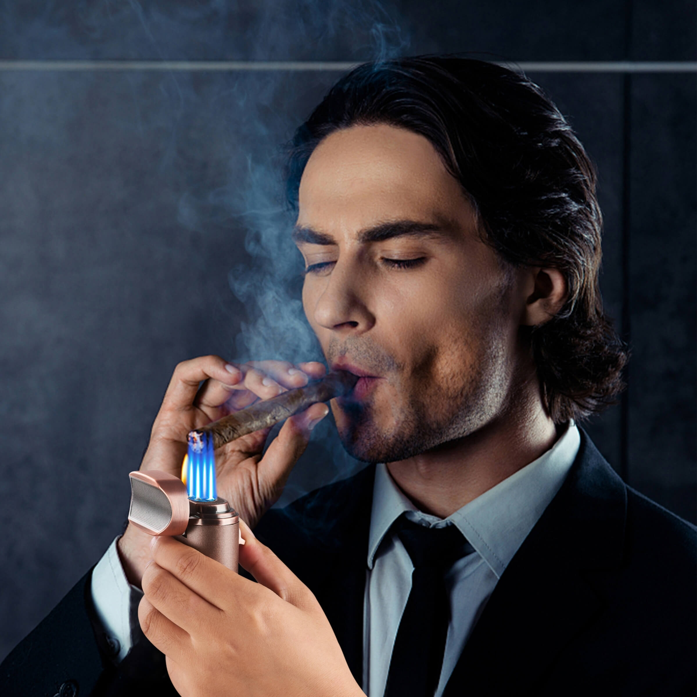 • Quadrupla fiamma jet: Il sistema di accensione a quattro getti assicura una fiamma potente, stabile e uniforme, perfetta per accendere sigari o tabacchi pregiati in modo rapido e omogeneo anche in condizioni di vento. La forza della combustione permette un’accensione completa senza bruciare i bordi, garantendo una combustione pulita e controllata.