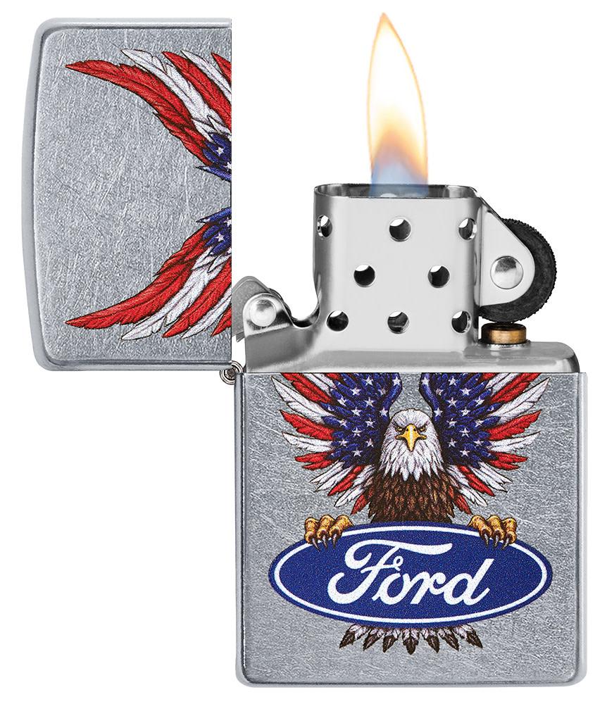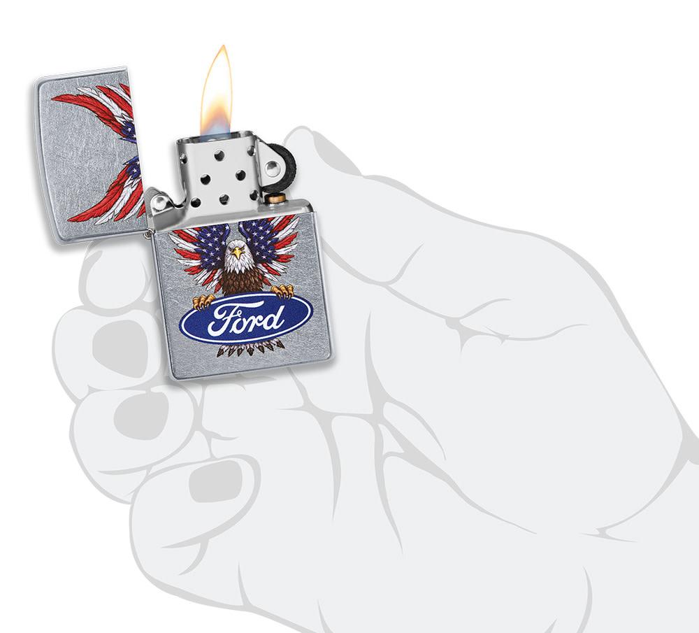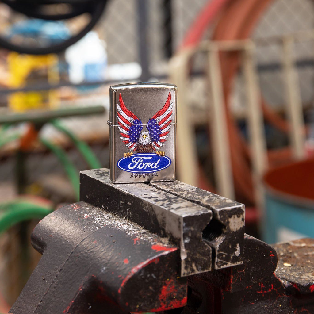 Da oltre un secolo, Ford produce veicoli negli Stati Uniti. Il design di questo accendino Street Chrome combina due icone americane, Bald Eagle e Ford. L'aquila calva, con stelle e strisce al posto delle ali, si aggrappa al logo ovale Ford. Questo design viene creato utilizzando il processo di imaging a colori. Viene confezionato in una confezione regalo. Per prestazioni ottimali, riempire con carburante per accendini Zippo.- Accendino antivento Zippo originale con caratteristico "click" Zippo- Costruito interamente in metallo; grazie al design antivento funziona praticamente ovunque- Ricaricabile per tutta la vita; per prestazioni ottimali, consigliamo il fluido, le pietrine e gli stoppini originali Zippo- Made in USA; famosa Garanzia Zippo "it works or we fix it for free"- Liquido di ricarica Zippo venduto separatamente