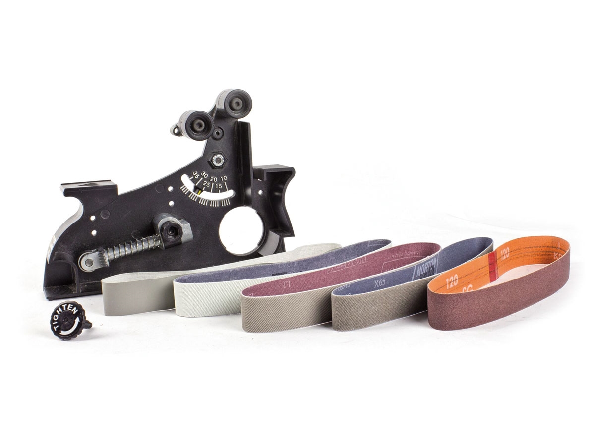 Il supporto è stato disegnato per la sagomatura del coltello, l'affilatura e e varie rifiniture. Usa nastri abrasivi 1" x 18" in una vasta gamma di grana ed una guida di precisione regolabile da 10° a 35° con incrementi di 1° . La velocità è regolabile da 1200-2800 SFM (square feet per minute).