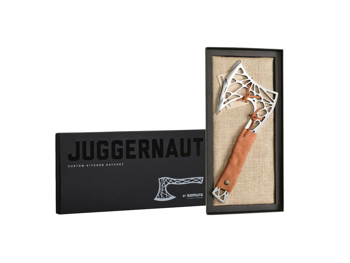 La JUGGERNAUT è un'accetta da cucina unica nel suo genere, con un design traforato la rende leggera e bilanciata. L'intera ascia è realizzata in Hardox Extreme 450, un acciaio estremamente resistente, mentre il manico è avvolto da un cinturino in pelle che si chiude con un bottone a pressione e che ne migliora la presa. La Juggernaut è ideale per macellare, disossare e tritare carne e verdure.