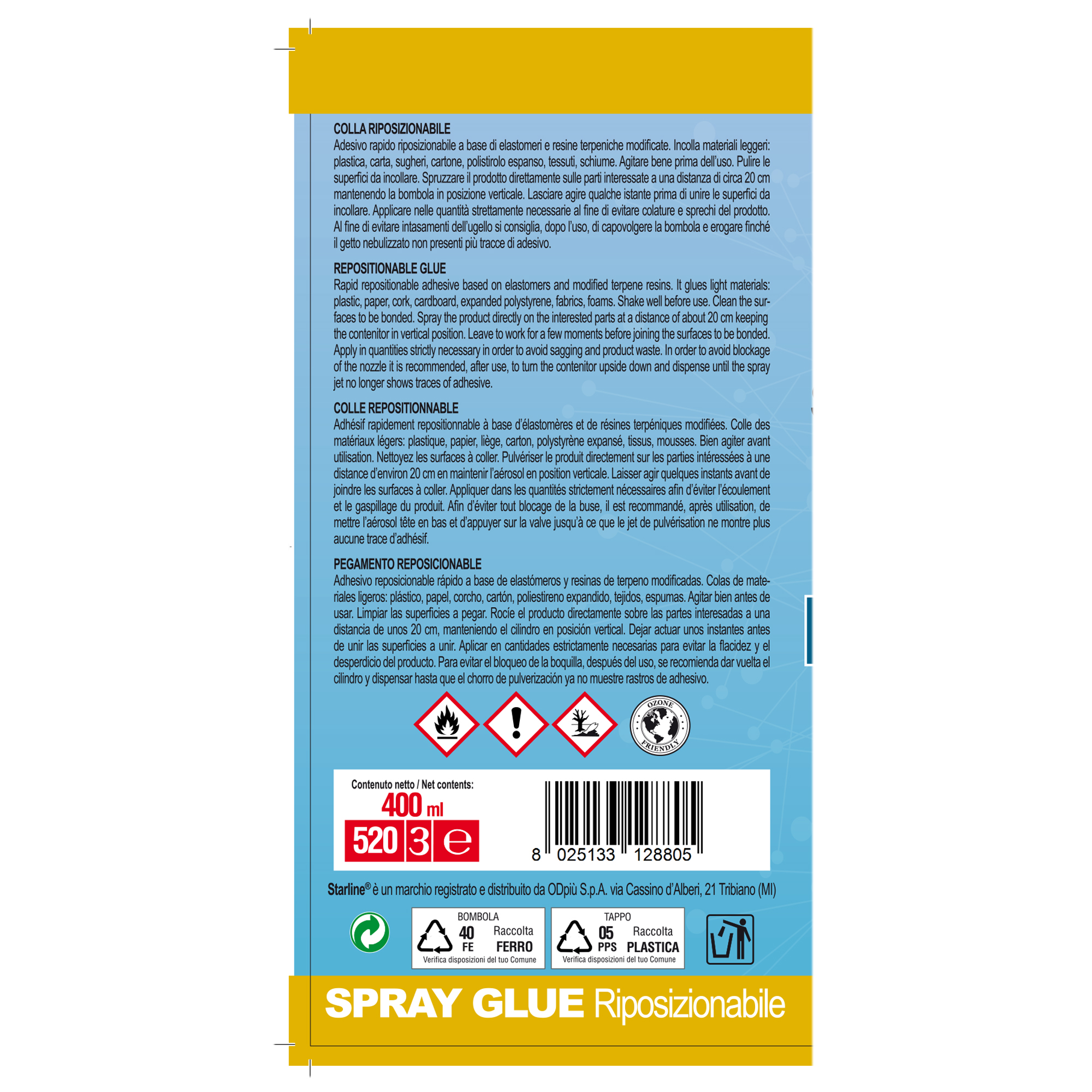 ADESIVO RAPIDO RIPOSIZIONABILE A BASE DI ELASTOMERI E RESINE TERPENICHE MODIFICATE. INCOLLA MATERIALI LEGGERI:PLASTICA, CARTA, SUGHERI, CARTONE, POLISTIROLO ESPANSO, TESSUTI, SCHIUME. AGITARE BENE PRIMA DELL’USO. PULIRE LESUPERFICI DA INCOLLARE. SPRUZZARE IL PRODOTTO DIRETTAMENTE SULLE PARTI INTERESSATE A UNA DISTANZA DI CIRCA 20 CMMANTENENDO LA BOMBOLA IN POSIZIONE VERTICALE. LASCIARE AGIRE QUALCHE ISTANTE PRIMA DI UNIRE LE SUPERFICI DAINCOLLARE. APPLICARE NELLE QUANTITA' STRETTAMENTE NECESSARIE AL FINE