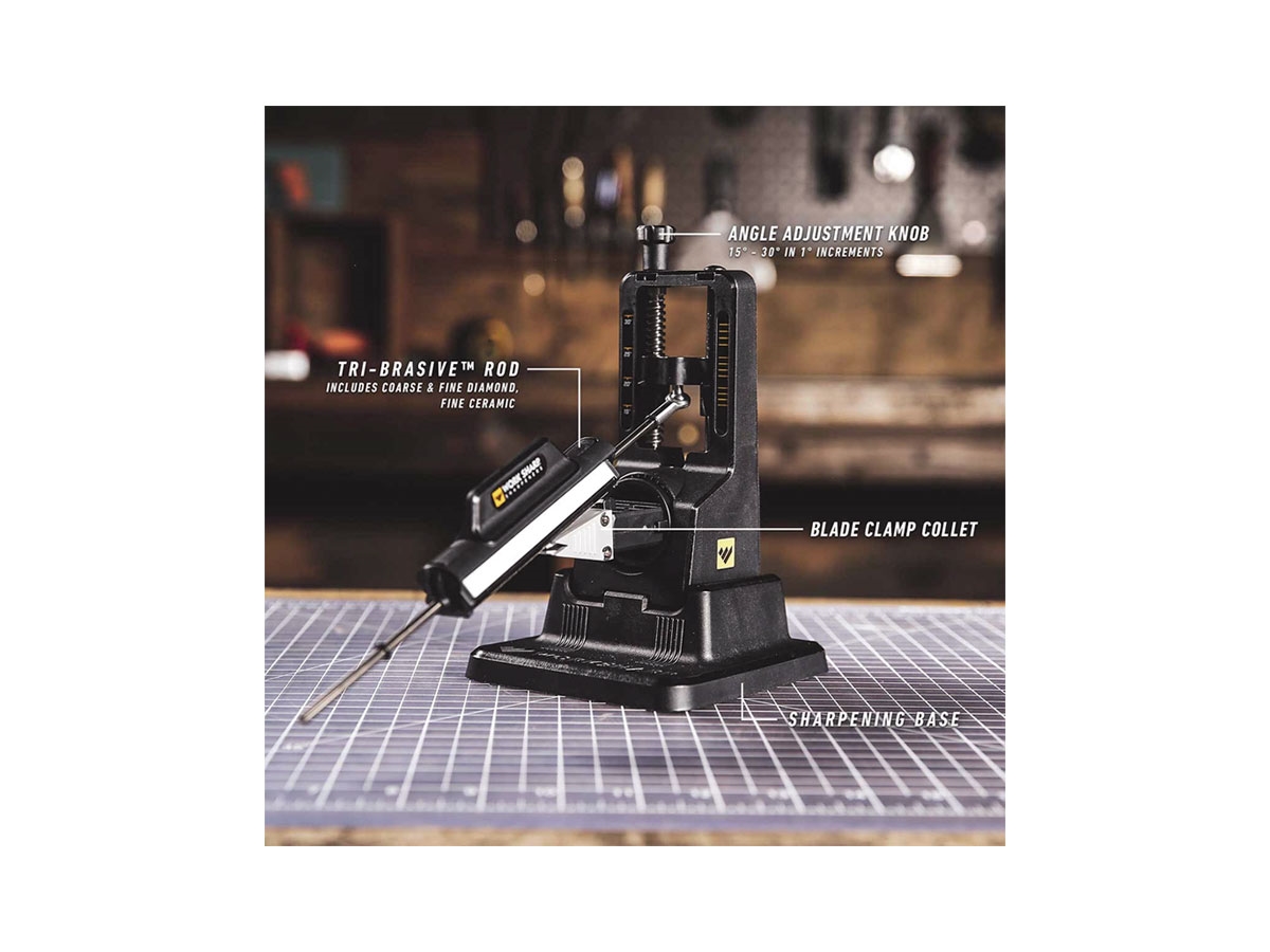 Il Work Sharp Precision Adjust Knife Sharpener è un sistema di affilatura per coltelli regolabile in angolazione e con tre grane abrasive. La base (sharpening base) fornisce una piattaforma stabile per l'affilatura da banco ed il morsetto (blade clamp collet) dal design innovativo fissa il coltello in modo rapido e sicuro. L'asta (Tri-Brasive Rod) ha sui tre lati una piastra diamantate a grana grossa 320 ed una a grana fine 600 (per ripristinare rapidamente il filo del coltello) ed una pietra in ceramica a grana fine (per affinare il filo). L'angolo di affilatura può essere facilmente regolato da 15° a 30° con incrementi di 1°.