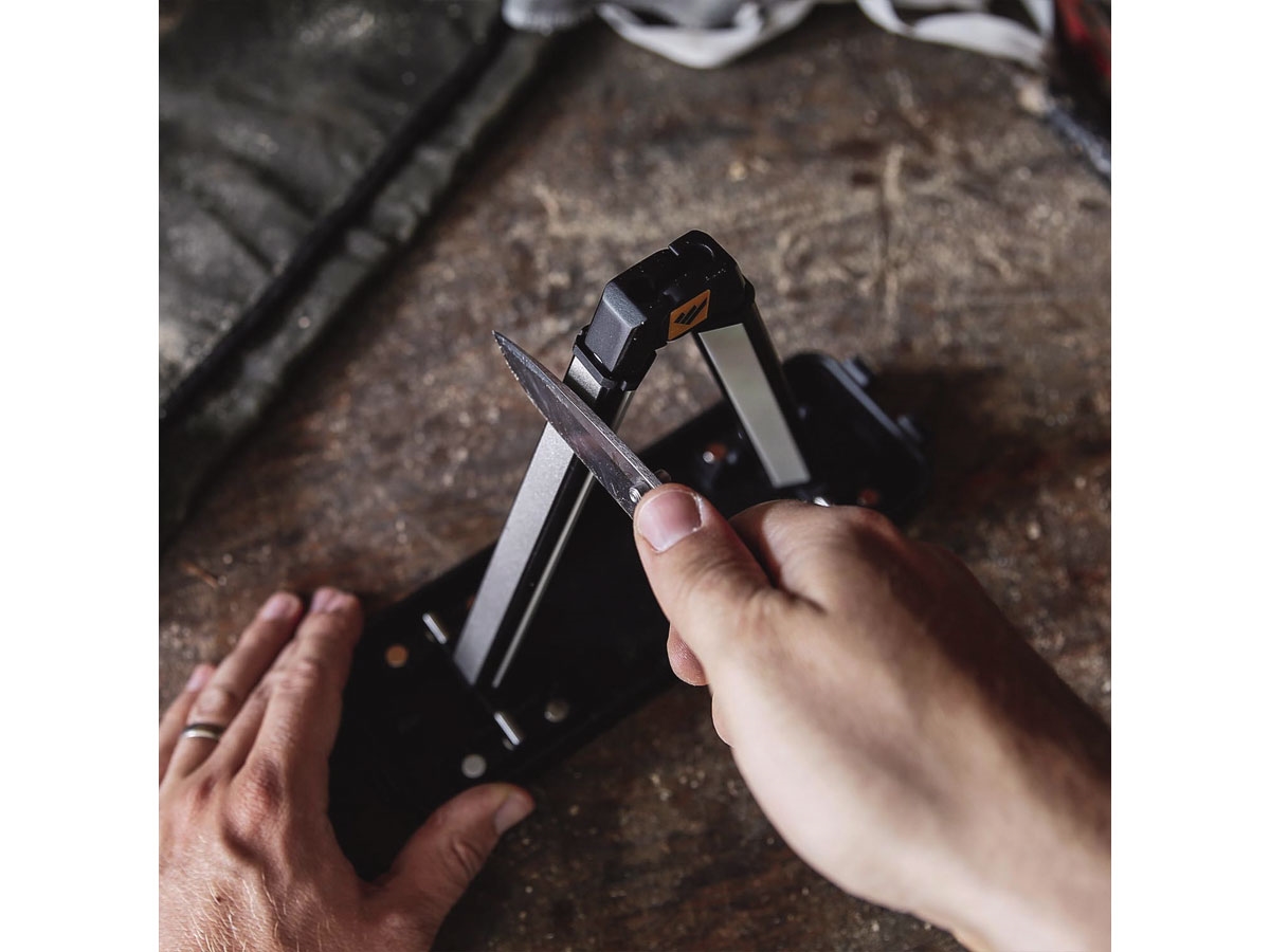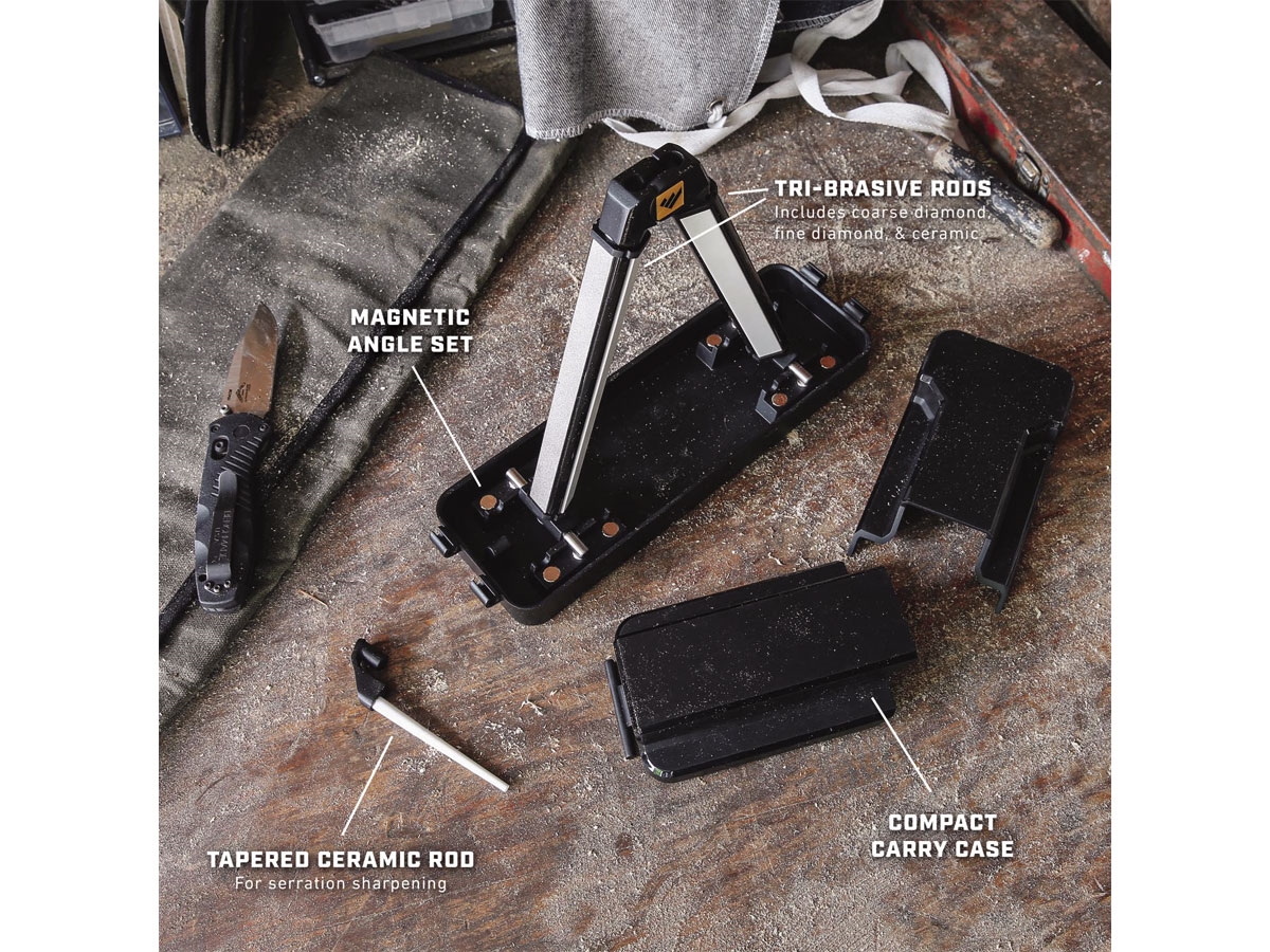 Progettato dal famoso knifemaker Ken Onion, l'affilatore Angle Set è completo, versatile e regolabile. Le stecche a 3 lati forniscono piastre diamantate a grana grossa e fine per ripristinare rapidamente il filo, mentre la pietra in ceramica a grana fine lo perfeziona rendendolo incredibilmente affialto. Gli angoli di affilatura possono essere impostati su 15 °, 17,5 °, 20 °, 22,5 ° o 25 °. Le stecche Tri-Brasive ad angolo sono state progettate per ruotare di 360 gradi in modo da non essere bloccate in una singola posizione di approccio per l'affilatura. Permettono di spostarsi rapidamente tra le superfici abrasive e di creare un'ergonomia perfettamente confortevole durante l'affilatura. L'affilatore si richiude comodamente e si ripone in una custodia compatta.