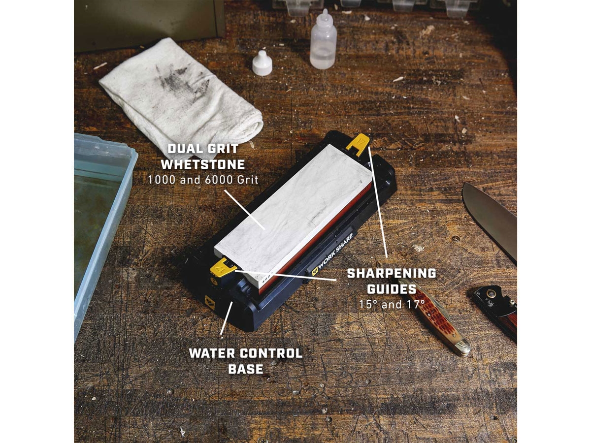 L'affilatore da banco Whetstone è un sistema di affilatura angolare con pietra a grana doppia per coltelli ed utensili a spigolo vivo. Si utilizza la pietra a grana 1000 per affilare e ripristinare un bordo, quindi la pietra a grana 6000 per creare un filo estremamente affilato e una rifinitura. La pietra ad acqua è veloce, dura a lungo e crea una sorta di sospensione durante l'affilatura. La base offre una piattaforma stabile, grazie ai piedini antiscivolo, e permette di controllare l'acqua per poi pulire facilmente. Le guide angolari offrono la precisione nel mantenimento del filo e rendono la pulizia rapida e semplice. Le guide di affilatura sono intercambiabili da 15 ° o 17 ° e sono opzionali da usare. Si possono affilare coltelli da cucina di tutti i tipi e può essere utilizzato anche su coltelli tascabili e da filetto.