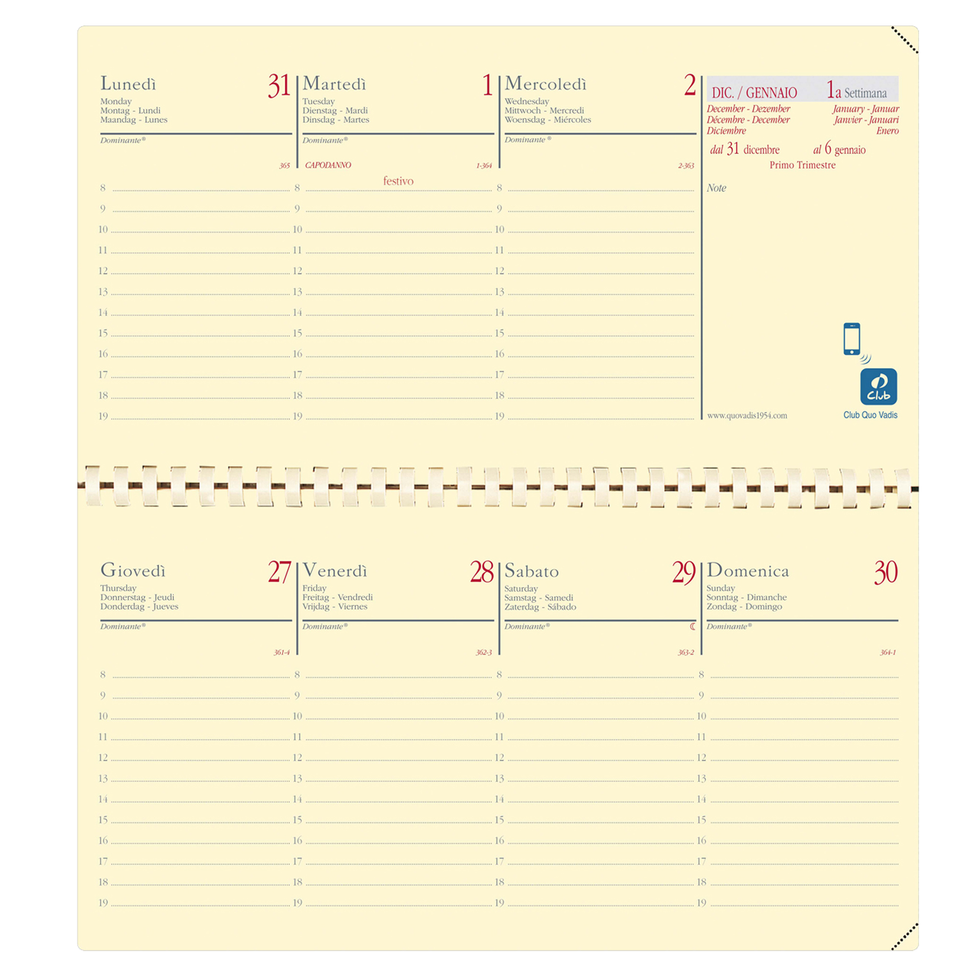 Articolo in prenotazione, in consegna a partire dal mese di luglio 2024.Agenda settimanale tascabile in formato orizzontale, una settimana su due pagine. 13 mesi da dicembre a dicembre, informazioni pratiche e rubrica intercambiabile. Carta avorio certificata PEFC, stampa bicolore, rilegatura con spirale. Edizione italiana.