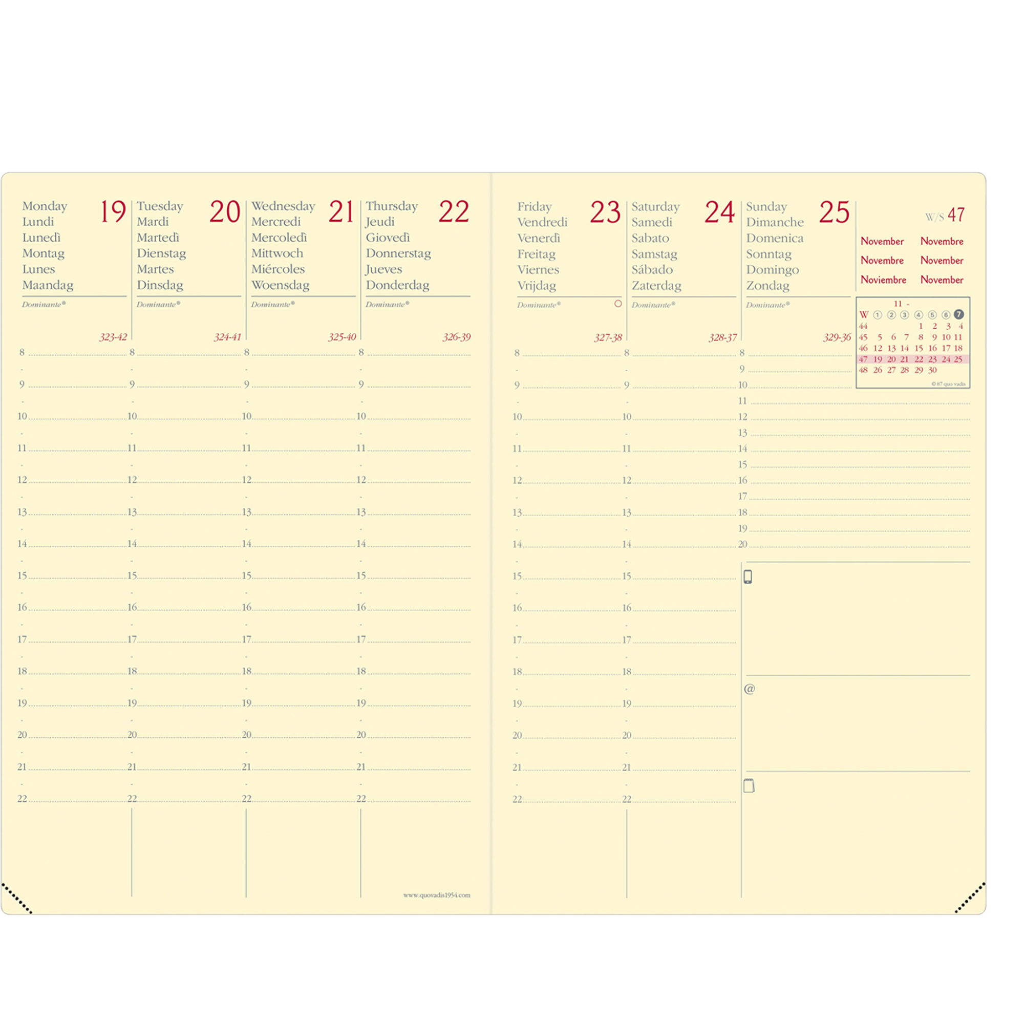 Agenda settimanale da ufficio, una settimana su due pagine. 13 mesi d dicembre a dicembre, pagine note intercambiabili, multilingue. Dotata di tasca a soffietto portabiglietti, chiusura con elastico verticale. Carta avorio certificata PEFC, stampa bicolore, rilegatura cucita.