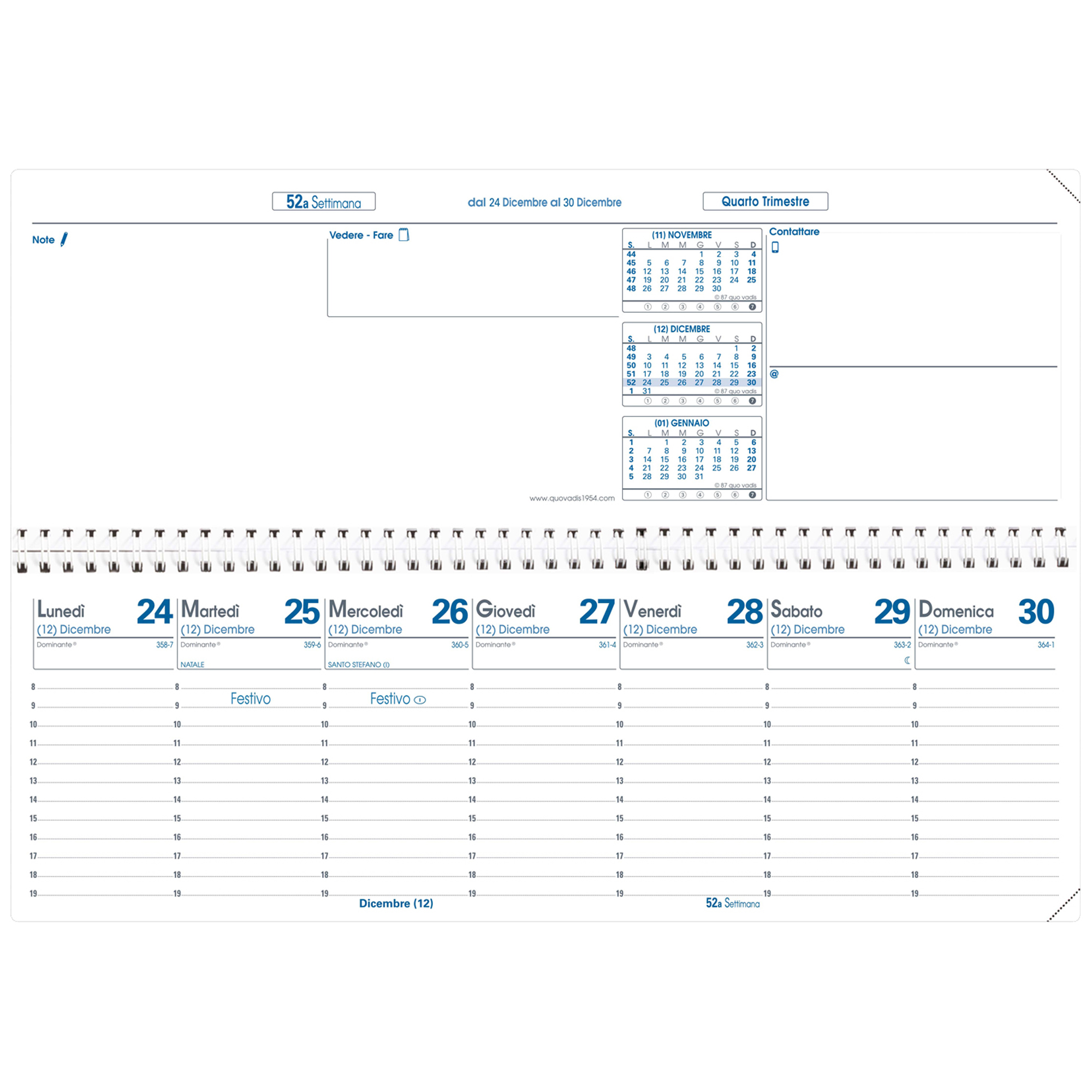 Agenda settimanale ideale per la scrivania in formato orizzontale con spirale metallica. 13 mesi da dicembre a dicembre, pagina superiore per le annotazioni, rubrica incorporata. Carta bianca certificata PEFC, stampa bicolore. Edizione italiana.