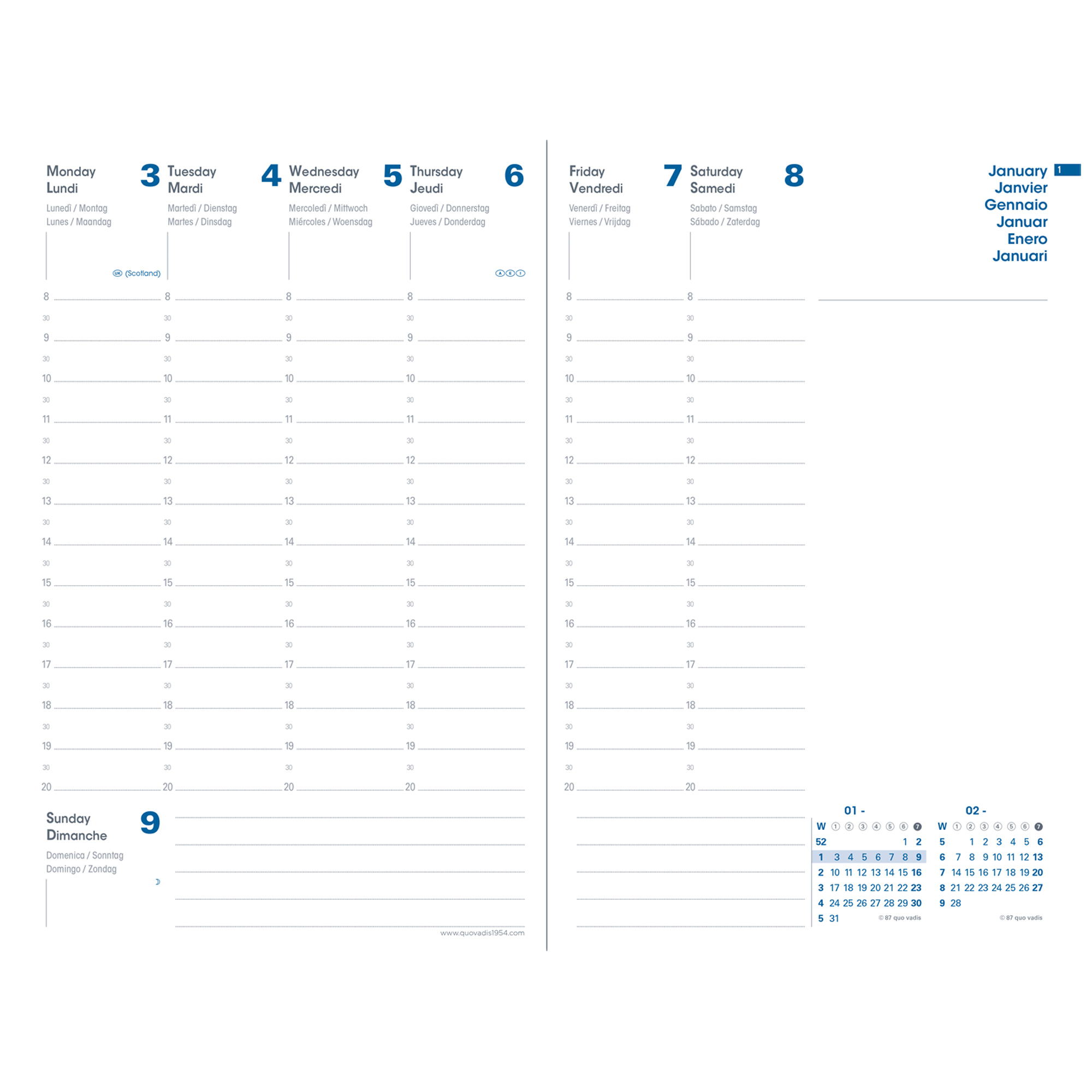 Agenda settimanale da ufficio, una settimana su due pagine. 13 mesi da dicembre a dicembre. Rubrica amovibile, carta 100% riciclata, certificata Blue Angel, stampa bicolore 100% inchiostro a base vegetale, rilegatura cucita. Copertina senza pftalati. Edizione multilinque.