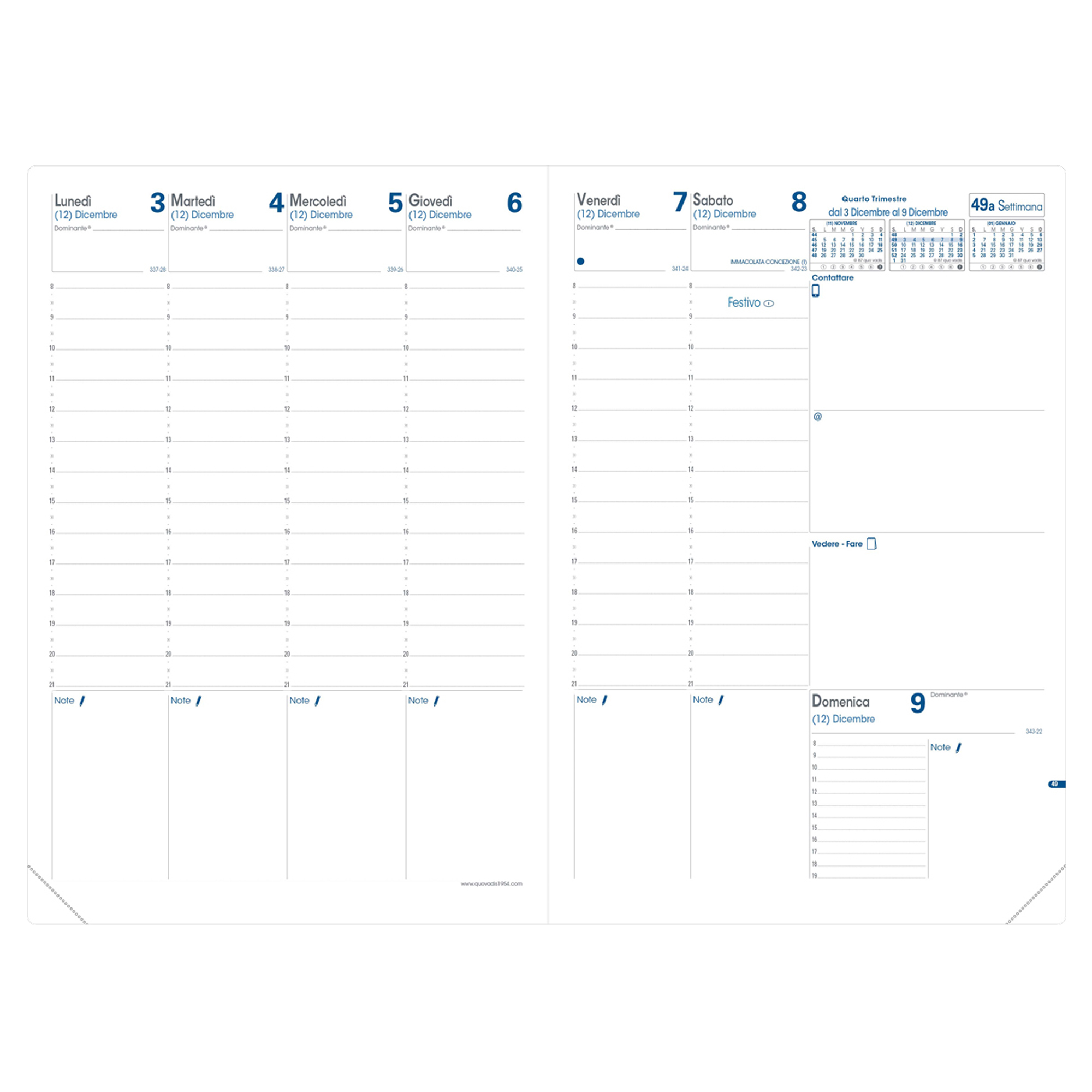 Agenda settimanale da ufficio, una settimana su due pagine con annotazioni giornaliere. 13 mesi da dicembre a dicembre. Carta bianca certificata PEFC stampa bicolore, rilegatura cucita. Edizione italiana.