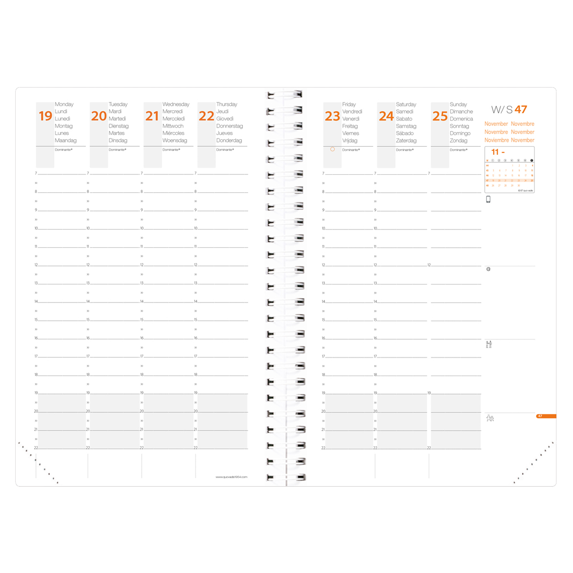Agenda settimanale da ufficio rilegatura con spirale. Una settimana su due pagine. 13 mesi da dicembre a dicembre, rubrica amovibile, 32 pagine di appunti riposizionabili, anno-Planing pieghevole. Rivestimento in grana effetto pelle, chiusura con elastico verticale e cucitura a sellaio tono su tono. Carta bianca certificata PEFC, stampa in quadricromia. Edizione multilingue.