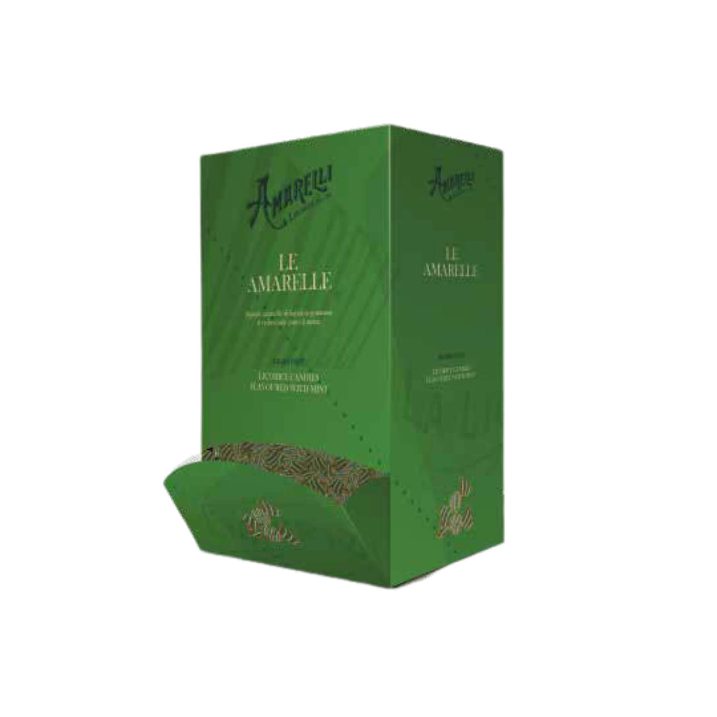 Amarelle: Caramelle Gommose di Liquirizia alla Menta, senza zucchero.Caramelle di Liquirizia Gommosa Senza Zucchero incartate singolarmente in una comoda confezione da 45g.Gusto: Liquirizia alla mentaConfezione: ScatolaPeso: 45gLiquirizie gommose dal gusto fresco, incartate singolarmente.Senza Zuccheri AggiuntiIngredienti: Edulcorante maltitolo, acesulfame K, addensante gomma arabica, acqua, liquirizia. aromi. Stabilizzate glicerolo agenti di rivestimento cera d'api, olio vegetale.Consistenza: Liquirizia gommosaInformazioni nutrizionali: Valori per 100g: Valore energetico / Energy value 550 Kj / 132 Kcal, Grassi / Fats 0 g, di cui / of which: Acidi grassi saturi / Saturated fats 0 g, Carboidrati / Carbohydrates 54 g, di cui / of which: Zuccheri / Sugars 0,5 g Fibre alimentari / Food Fibers 31 g Proteine / Proteins 0 g Sale / Salt 0 gConservazione: Si raccomanda di conservare il prodotto in luogo fresco ed asciutto, a una temperatura 18 – 25 °C e U.R. 55-65% e di mantenere la confezione integra, lontano da fonti di calore dirette e/o indirette, fonti di luce intensa naturale o artificiale e proteggerle da sbalzi di temperatura repentini.