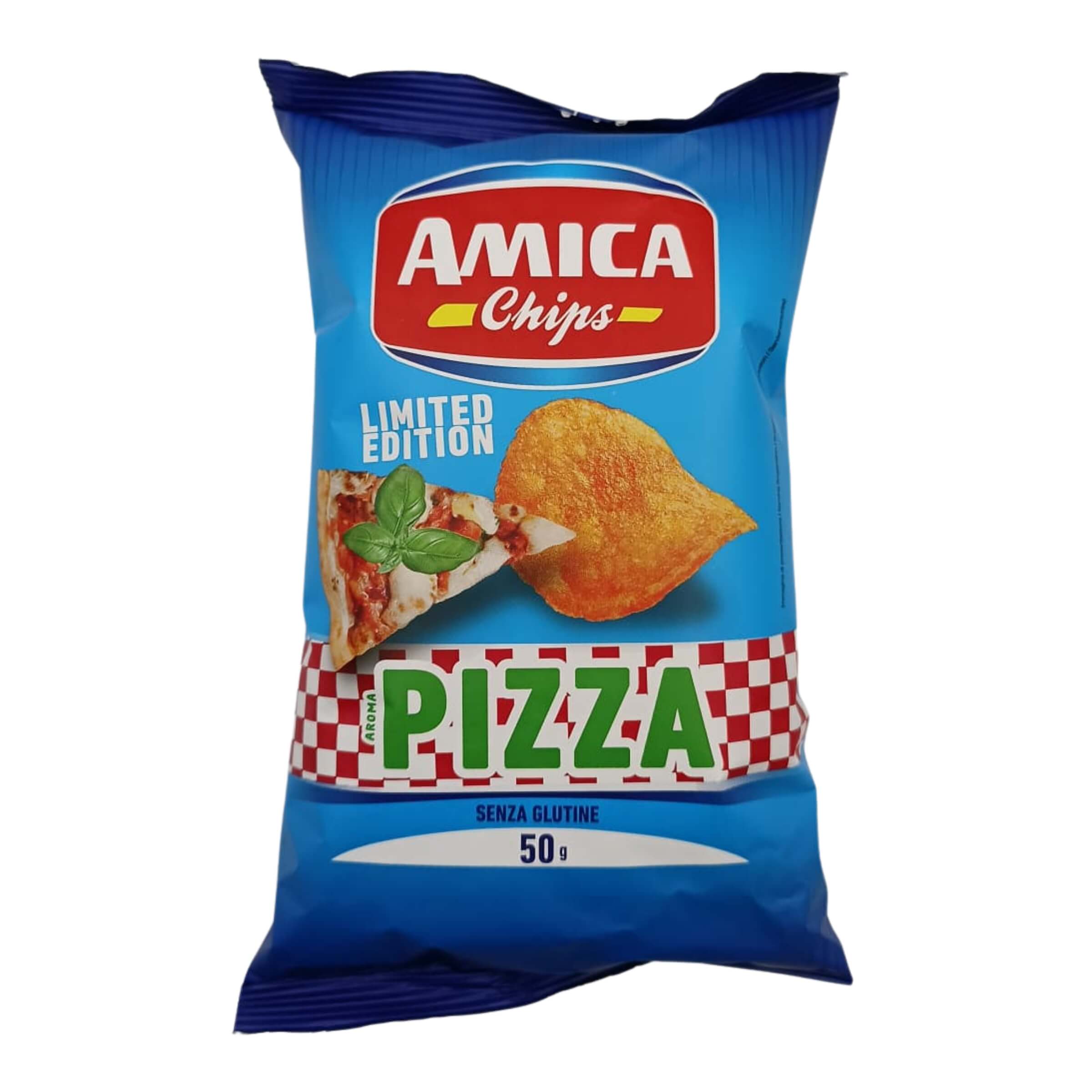 Le patatine Amica Chips Pizza racchiudono in ogni morso il gusto autentico della tradizione italiana. Croccanti e dorate, sono arricchite con un condimento dal sapore tipico della pizza, capace di fondere aromi di formaggio, pomodoro ed erbe aromatiche in un mix irresistibile. Realizzate in edizione limitata, offrono un’esperienza di gusto originale, perfetta per una pausa sfiziosa o per accompagnare momenti di convivialità. La ricetta senza glutine le rende adatte anche a chi segue un’alimentazione priva di glutine, senza rinunciare al piacere di uno snack dal sapore ricco e inconfondibile.• Gusto tipico italiano: Condimento ispirato alla pizza, con note di formaggio, pomodoro ed erbe aromatiche.• Croccantezza irresistibile: Patatine sottili e dorate, fritte per garantire una consistenza croccante ad ogni morso.• Ingredienti selezionati: Patate di qualità e aroma pizza accuratamente bilanciato per esaltare il sapore.• Edizione limitata: Disponibili solo per un periodo di tempo ristretto, ideali per chi ama provare sapori esclusivi.• Senza glutine: Adatte anche a chi deve evitare il glutine nella propria dieta.• Formato pratico: Confezione da 50 g perfetta per snack veloci, pause fuori casa o da condividere con amici.IngredientiPatate, olio di semi di girasole, aroma gusto pizza (6%) (contiene formaggio e derivati del latte), sale, colorante: estratto di paprika E160c. Senza glutine.Valori nutrizionali per 100 g• Energia: 2247 kJ / 539 kcal• Grassi: 32 g• Grassi saturi: 3,8 g• Carboidrati: 54 g• Zuccheri: 3,1 g• Fibre: 3,4 g• Proteine: 6,5 g• Sale: 1,50 gLe patatine Amica Chips Pizza sono lo snack perfetto per chi ama i sapori decisi e avvolgenti, unendo la fragranza della frittura al gusto tipico della pizza italiana.