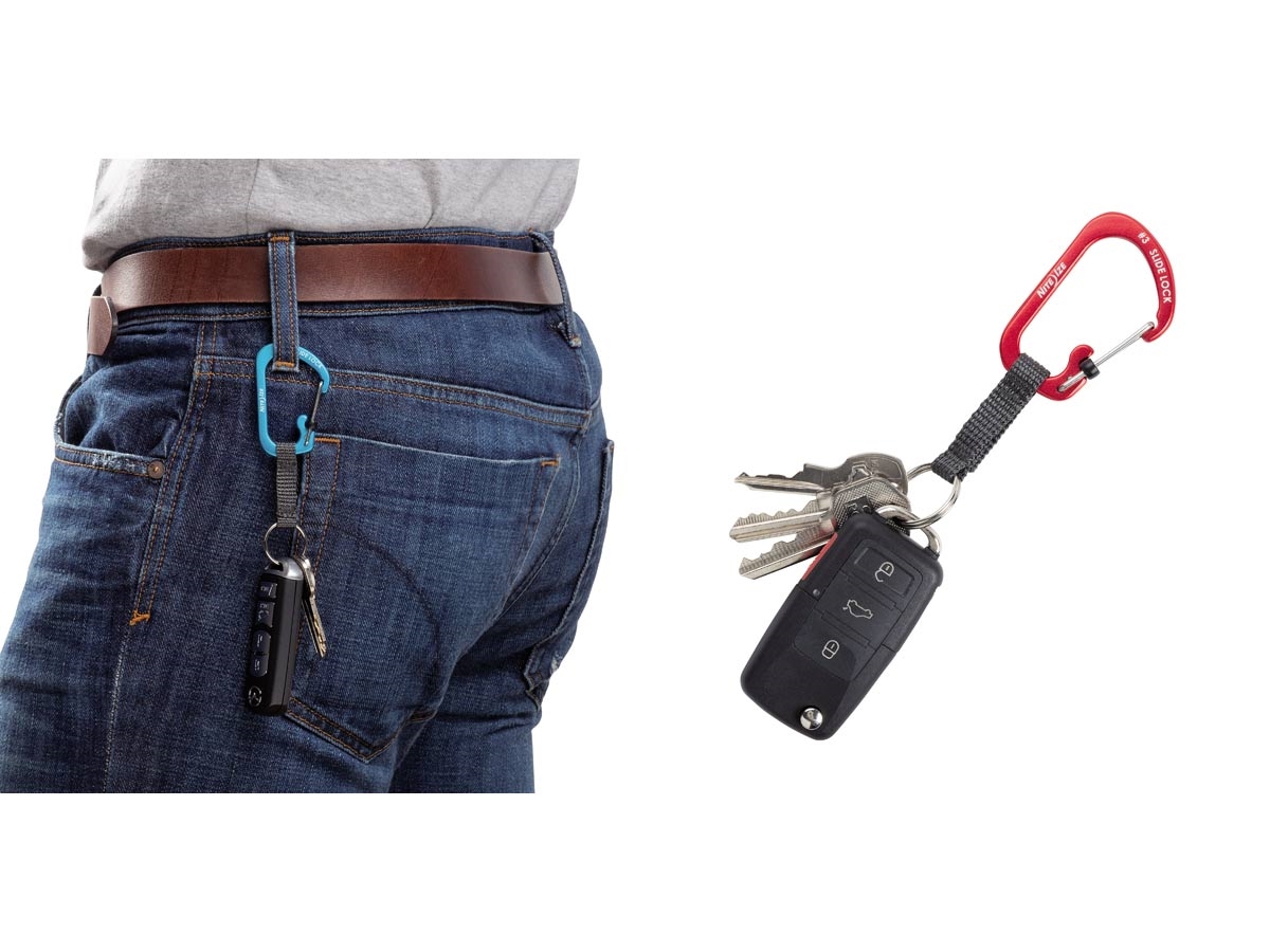 Il moschettone colorato in alluminio e il portachiavi sono uniti da un breve cinturino in nylon per tenere le chiavi separate, ma collegate. Il moschettone è dotato di un meccanismo SlideLock che blocca il cancello in modo che possa essere fissato con sicurezza al passante di una cintura, allo zaino o ad una tracolla.