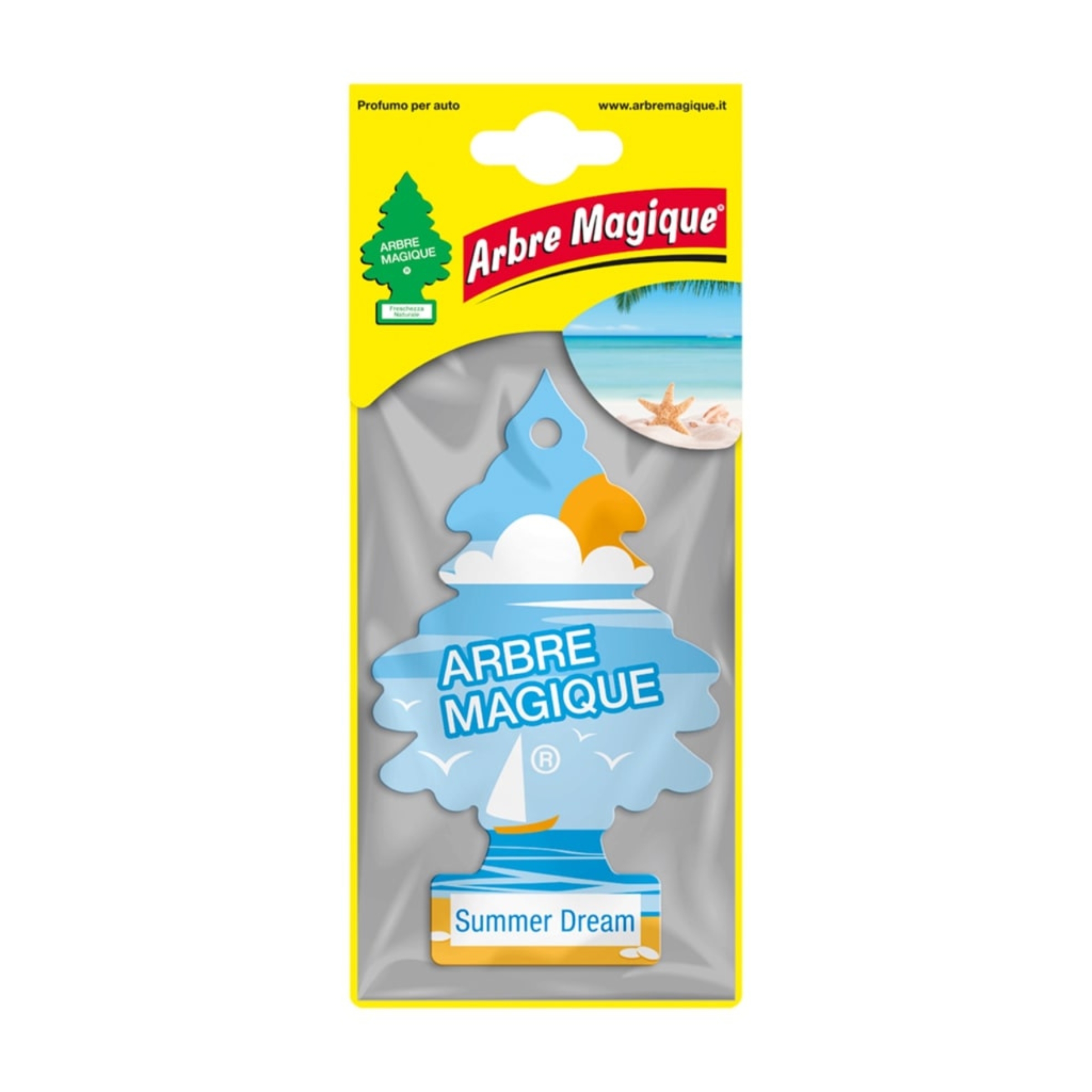 Arbre Magique Summer Dream racchiude in sé l'essenza della stagione più amata, trasportando la freschezza e il brio dell'estate direttamente all'interno della tua auto.• Fragranza Estiva e Frizzante: Questo deodorante per auto si veste dei colori del mare e del cielo sereno, offrendo note di testa agrumate che si mescolano con sfumature aromatiche e fiorite, evocando l'allegria di un'uscita in barca.• Esperienza Olfattiva Coinvolgente: Le note finali di ambra riportano alla mente la dolce sensazione delle giornate trascorse in spiaggia sotto un caldo sole, rendendo ogni viaggio un piacevole rifugio estivo.Arbre Magique Summer Dream è l'ideale per chi desidera mantenere vivo lo spirito dell'estate tutto l'anno, offrendo una pausa rinfrescante e vivace durante la guida quotidiana.