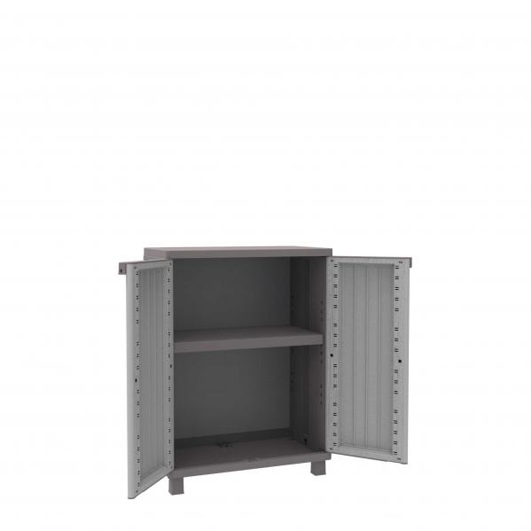 LINEA DI ARMADI MODULARI CON ROBUSTA STRUTTURA IN PPL ED ELEGENTE FINITURA LEGNO COLOR TORTORA. GLI ARMADI HANNO ANTE APRIBILI A 180 E RIPIANI REGOLABILI. PIEDINI RIALZATI E PREDISPOZIZIONE PER IL LUCCHETTO. ADATTO SIA PER AMBIENTI INTERNI CHE ESTERNI. ARMADIETTO A 2 ANTE CON 1 RIPIANO REGOLABILE. L68 X P37,5 X H91,5CM.