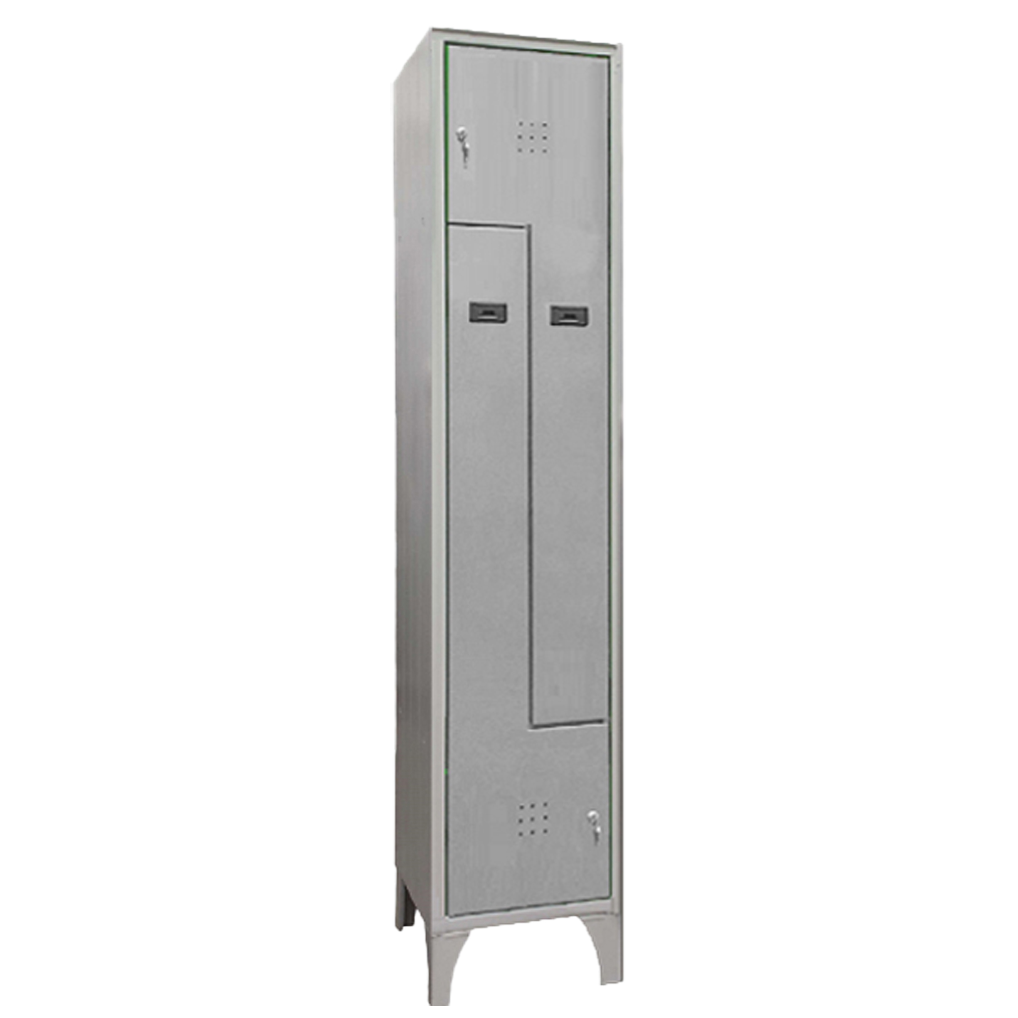 Armadio spogliatoio monoblocco (elettro-puntato non assemblato su piedi con doppia porta a L ogni colonna singola. Struttura portante realizzata in lamiera d'acciaio profilata prima scelta spessore 6/10. N. 2 ante contrapposte per colonna volte ad ottimizzare lo spazio, dotate di canottatura di rinforzo, di fori di aerazione e porta cartellino in materiale plastico. Vano calzature diviso da vano vestiario. Cerniere interne speciali antiscasso con perno di rotazione interno invisibile ad anta chiusa