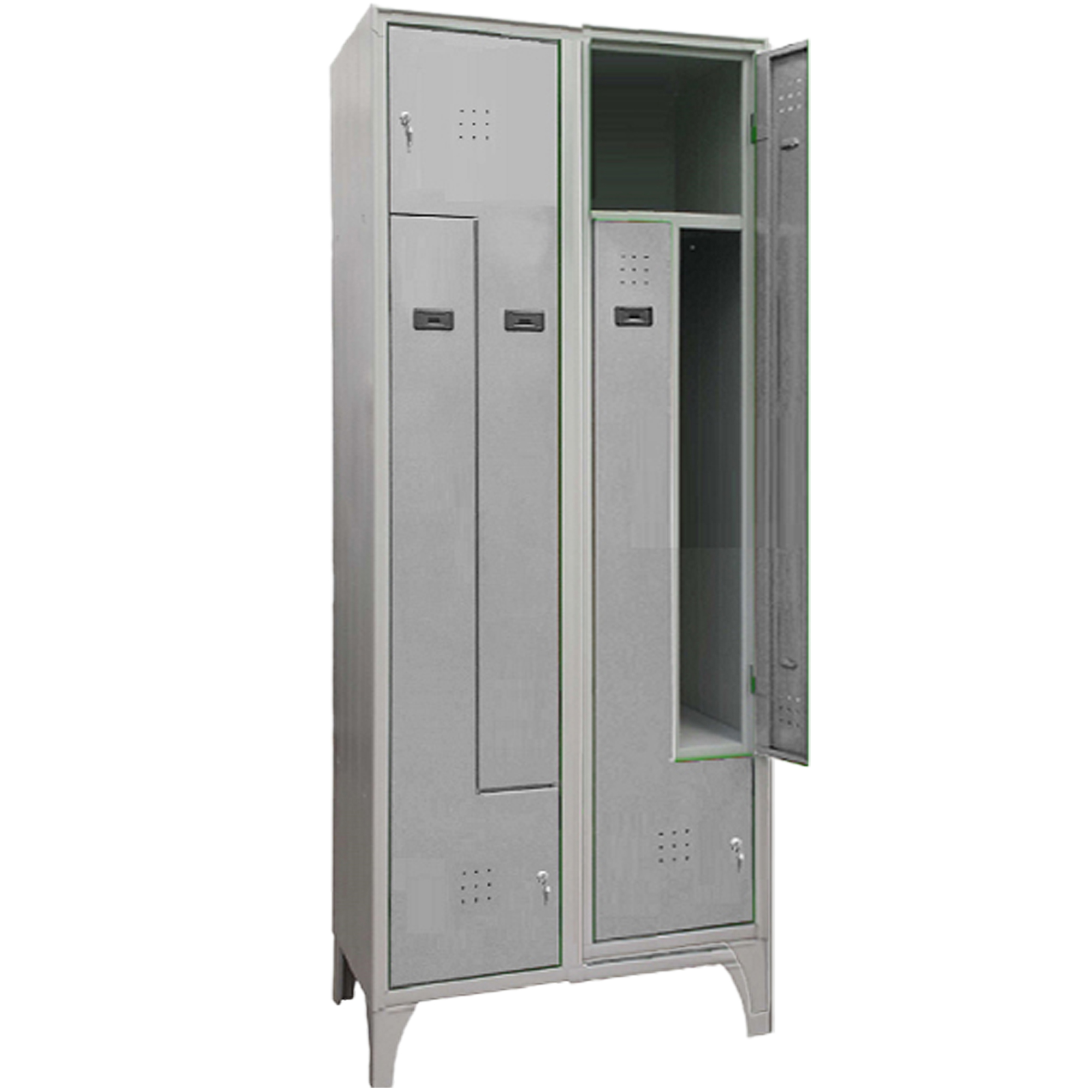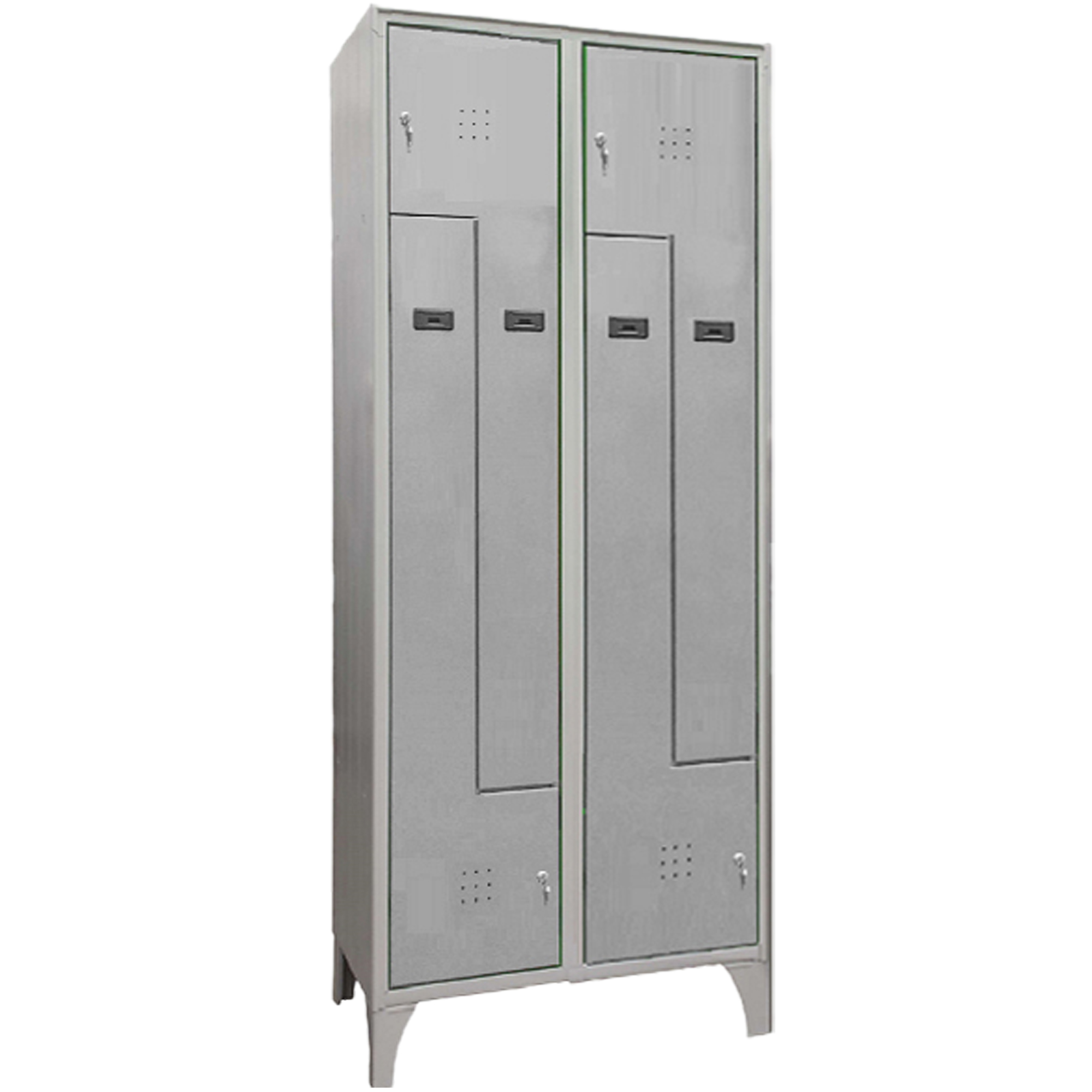 Armadio spogliatoio monoblocco (elettro-puntato non assemblato su piedi con doppia porta a L ogni colonna singola. Struttura portante realizzata in lamiera d'acciaio profilata prima scelta spessore 6/10. N. 2 ante contrapposte per colonna volte ad ottimizzare lo spazio, dotate di canottatura di rinforzo, di fori di aerazione e porta cartellino in materiale plastico. Vano calzature diviso da vano vestiario (maggior igiene