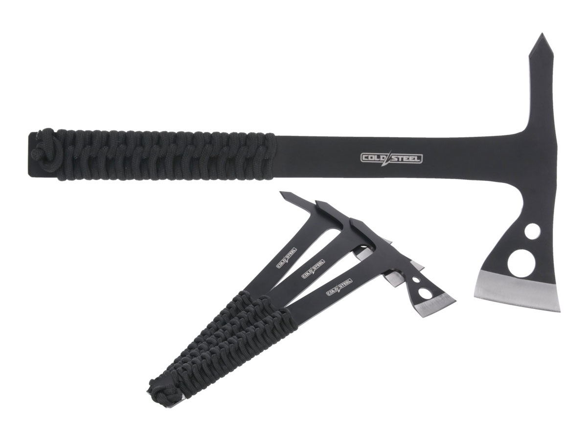 Queste asce in acciaio monopezzo sono progettate specificamente per il lancio al bersaglio. Sono realizzate in robusto acciaio 420SS e rifinite con un rivestimento in ossido nero resistente ai graffi. E' incluso un fodero in Nylon che le trasporta in sicurezza tutte e tre.