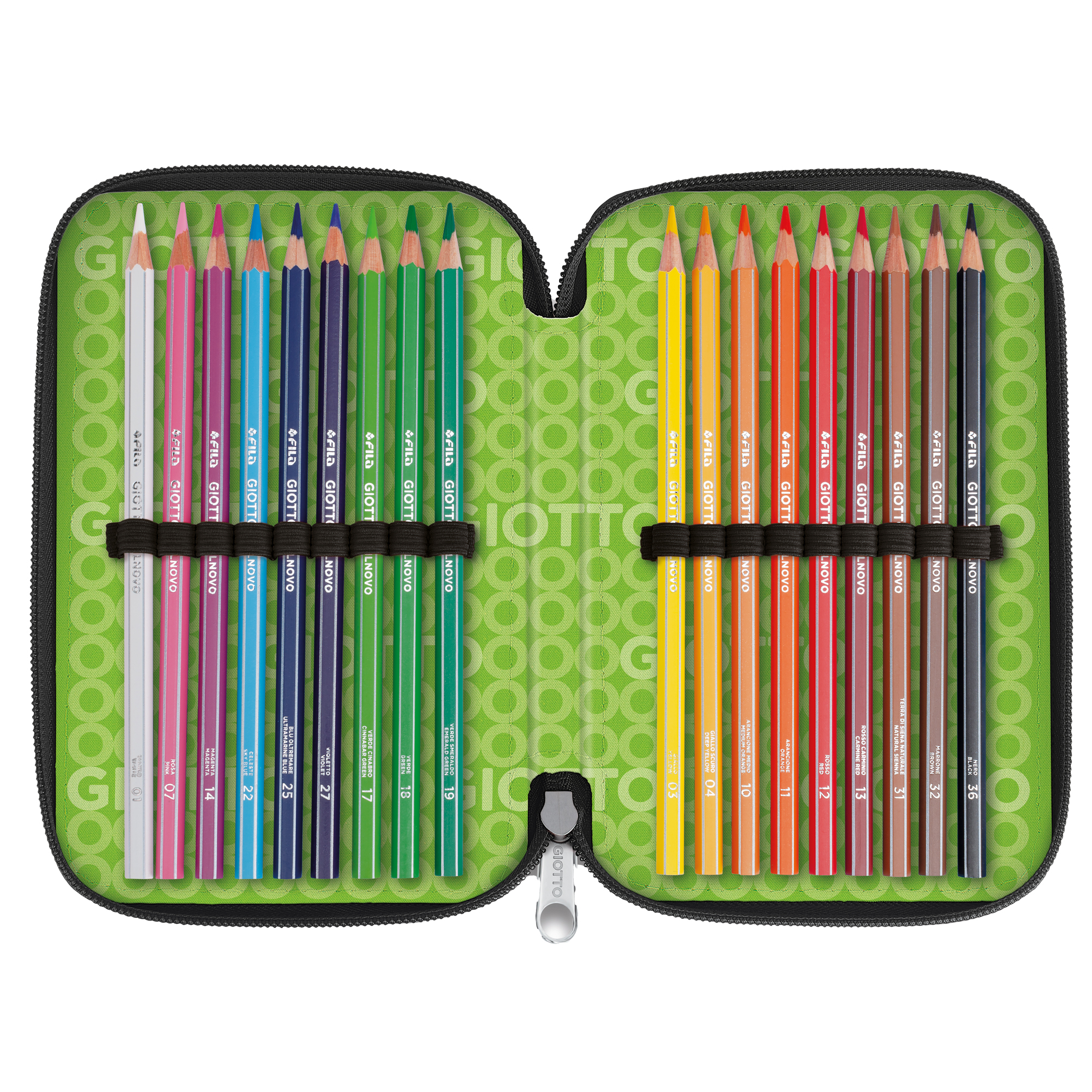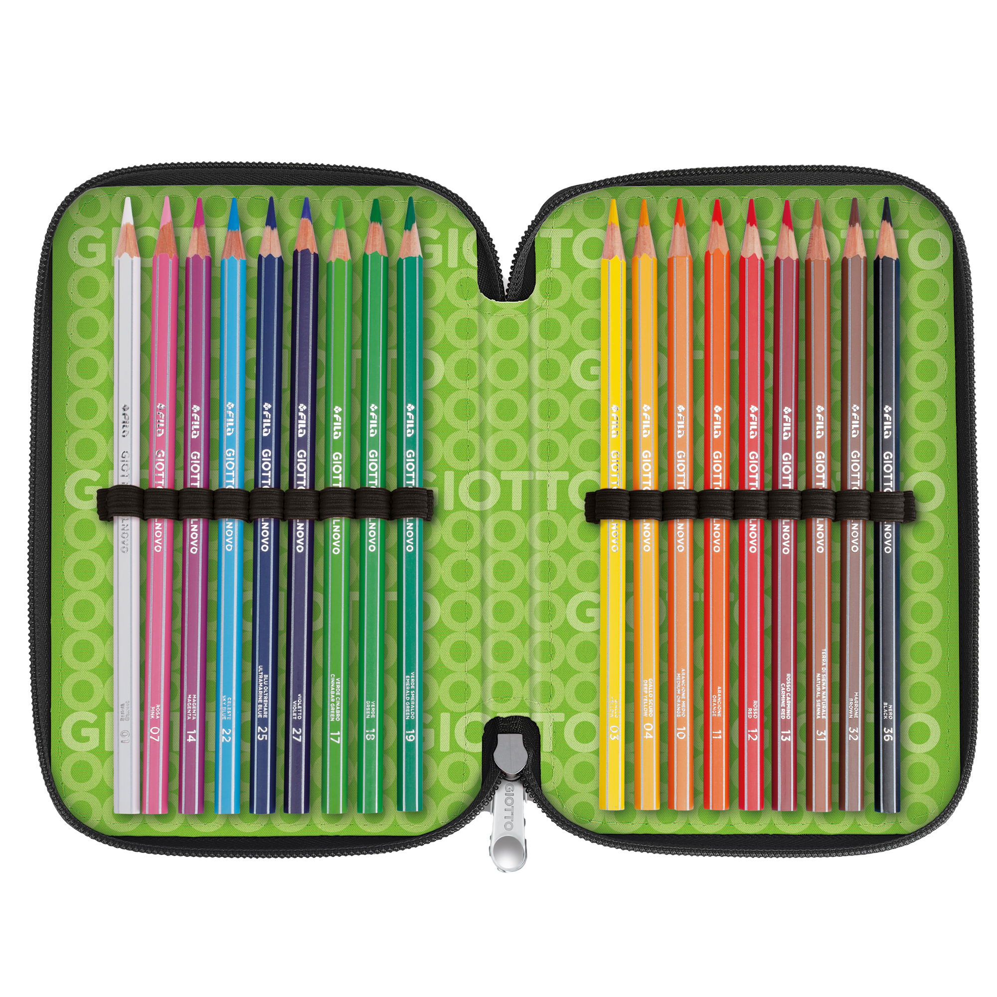 ASTUCCIO A 3 SCOMPARTI IN POLIESTERE 900D IMPERMEABILE DOTATO DI CERNIERA IN METALLO. CONTENUTO: 1 COLLA STICK DA 10GR, 1 RIGHELLO 15CM, 1 MAXI GOMMA NO-SIGN, 1 TEMPERAMATITE C/SERBATOIO, 1 FORBICE, PENNA TRATTO CANCELLIK ROSSO E BLU, 1 PENNA TRATTO UNO GREEN NERO, 1 MATITA HB, 1 MATITA 2B, 18 PENNARELLI TURBO COLOR E 18 PASTELLI STILNOVO MINA 3,3MM. Composto da 12