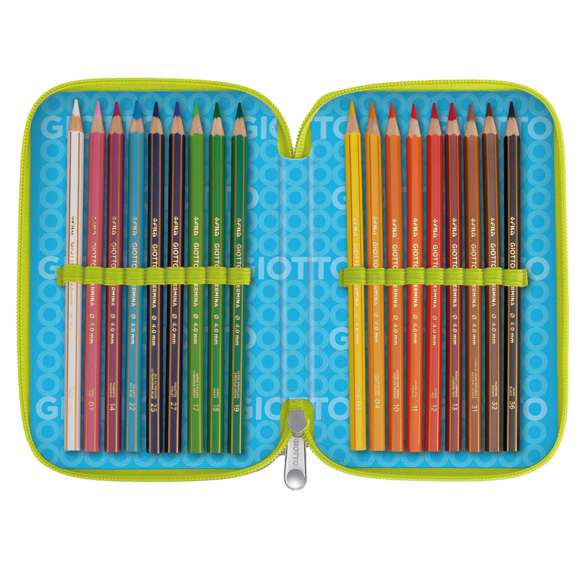 ASTUCCIO A 3 SCOMPARTI IN POLIESTERE 900D IMPERMEABILE DOTATO DI CERNIERA IN METALLO. CONTENUTO: 1 COLLA STICK DA 10GR, 1 RIGHELLO 15CM, 1 MAXI GOMMA NO-SIGN, 1 TEMPERAMATITE C/SERBATOIO, 1 FORBICE, PENNA TRATTO CANCELLIK ROSSO E BLU, 1 PENNA TRATTO UNO GREEN NERO, 1 MATITA HB, 1 MATITA 2B, 18 PENNARELLI TURBO COLOR E 18 PASTELLI SUPERMINA 4MM. Composto da 12