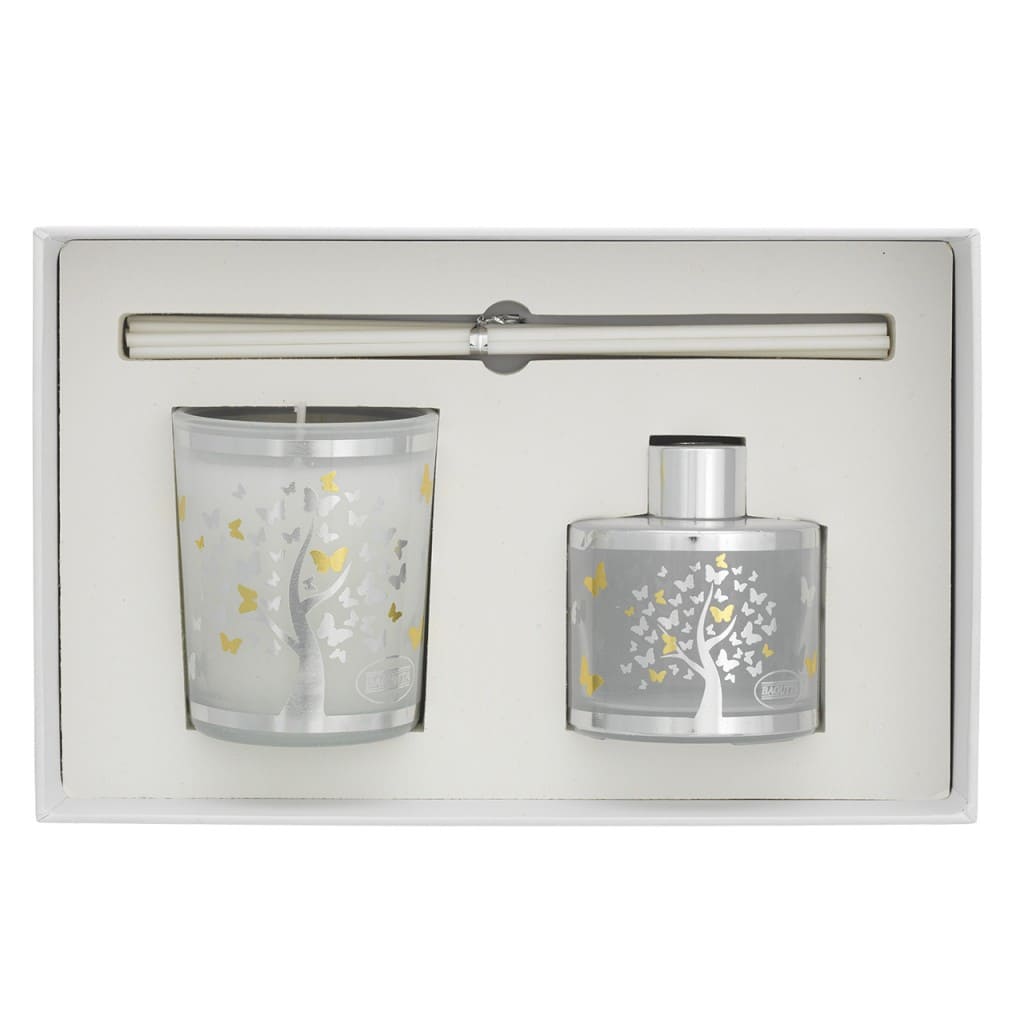 ASTUCCIO CON PROFUMATORE 50ml + CANDELA 70gr - ALBERO CON FARFALLE - 2185-01