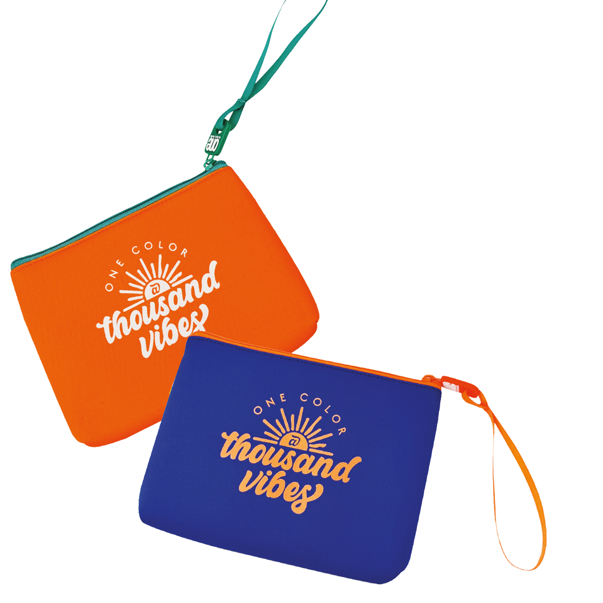 Astuccio pochette realizzato in neopren, un accessorio super trendy da utilizzare in qualunque momento. Dimensioni: 22x17x3cm. Colori assortiti con stampa: verde, blu, arancione e nero. Composto da 12