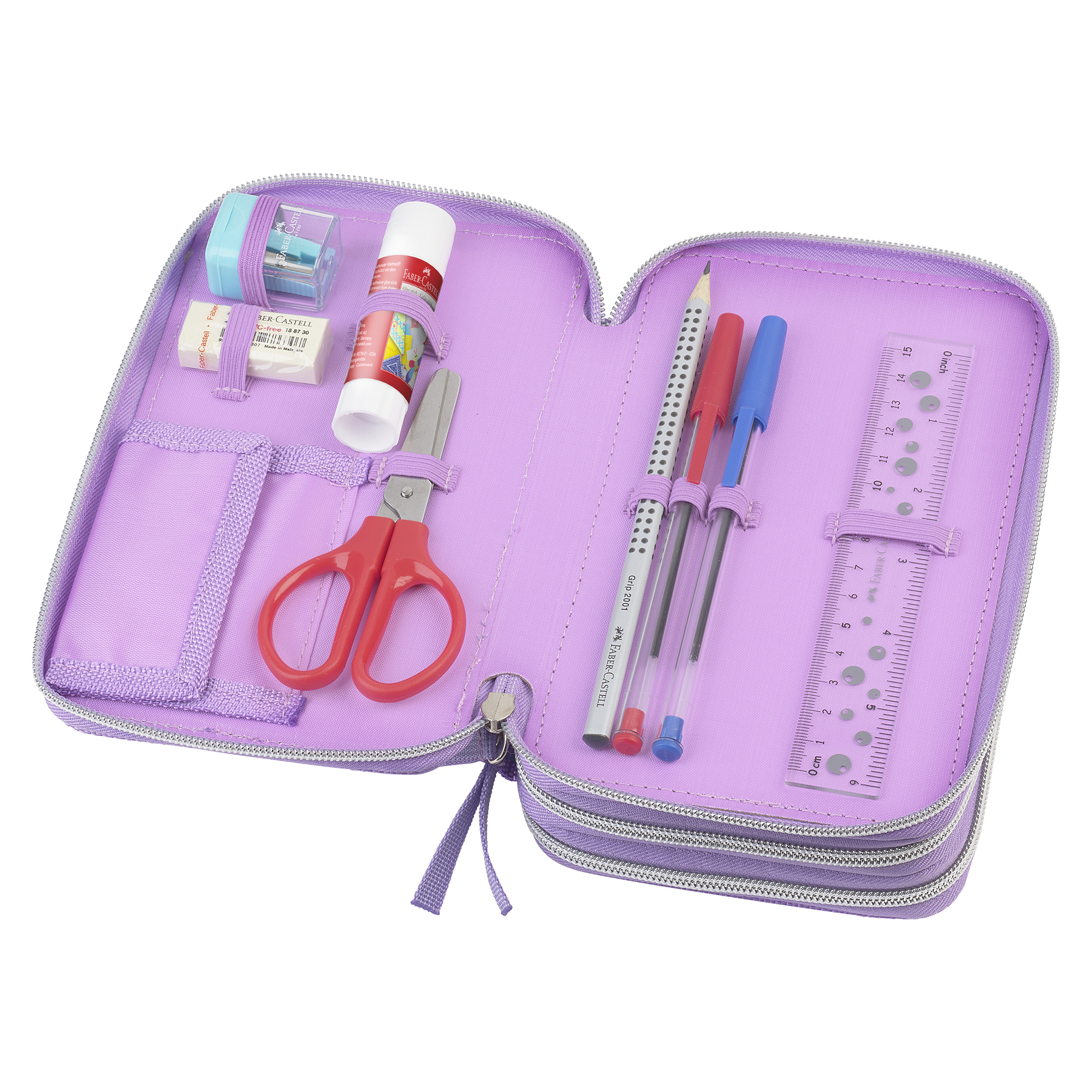 ASTUCCIO SUDDIVISO IN 3 SEZIONI, CONTENUTO: 18 MATITE COLORATE ESAGONALI, 18 PENNARELLI CON PUNTA IN FELTRO, 1 MATITA GRAFITE GRIP HB, 1 TEMPERINO MONOFORO C/CONTENITORE, 1 GOMMA, 1 RIGHELLO 15CM, 1 COLLA STICK DA 9GR, 1 PENNA SFERA BLU, 1 PENNA SFERA ROSSA E 1 FORBICE SCOLASTICA.