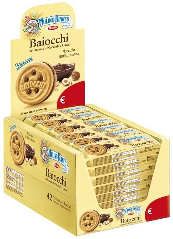 Biscotti di Pasticceria con crema alla nocciola e cacao. Biscotto: farina di frumento, zucchero, olio di semi di girasole, uova fresche, agenti lievitanti (carbonato acido di ammonio, carbonato acido di sodio, tartrato monopotassico), latte scremato in polvere, latte intero fresco pastorizzato, sciroppo di glucosio-fruttosio, sale, amido di frumento, aroma. Crema alla nocciola e cacao 26,5%: zucchero, grassi ed oli vegetali (karitè, cocco, cacao) nocciole 6,4% sul prodotto finito, cacao 2,7% sul prodotto finito, latte scremato in polvere, amido di frumento, aroma. Può contenere tracce di: soia e altra frutta a guscio. Gli ingredienti evidenziati possono provocare reazioni in persone allergiche o intolleranti. I dolcetti Mulino Bianco sono preparati senza l’utilizzo di conservanti, coloranti, grassi idrogenati e additivi edulcoranti. Conservare in luogo fresco e asciutto.