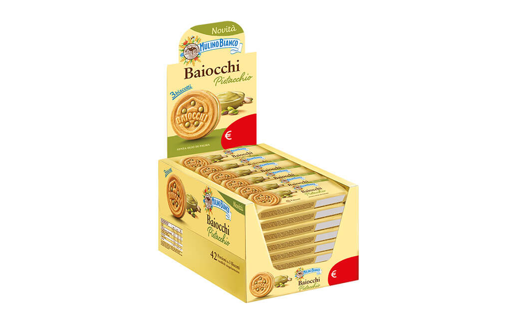 Ideali per una merenda fuori casa e disponibili in 42 comode monoporzioni da 3 biscotti contenute all’interno di un espositore da banco.