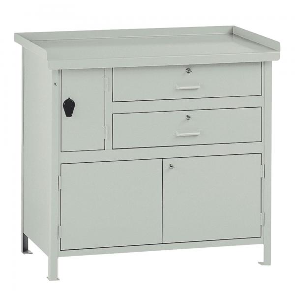 BANCO DA LAVORO IN LAMIERA CON PIANO SPESSORE 25/10, 2 CASSETTI SCORREVOLI SU GUIDE CON CUSCINETTI A SFERA E SERRATURA, 1 VANO LATERALE CON NASELLO IN PLASTICA LUCCHETTABILE ED 1 VANO INFERIORE CON SPORTELLI. VERNICIATURA A POLVERE GRIGIO RAL 7038. DIMENSIONI: 100LX67PX90HCM. PORTATA 1200KG (INTESA PER CARICHI UNIFORMEMENTE DISTRIBUITI). FORNITO MONTATO.