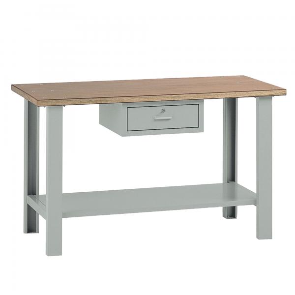 BANCO DA LAVORO CON PIANO IN LEGNO IMPIALLACCIATO IN NOCE TANGANIKA E BORDATO IN FAGGIO SPESSORE MM. 40, 2 FIANCATE, 1 SOTTOPIANO SAGOMATO E RINFORZATO, 1 CASSETTO SCORREVOLE SU GUIDE CON CUSCINETTI A SFERA E SERRATURA. PORTATA KG.1000. VERNICIATURA A POLVERE GRIGIO RAL 7038. DIMENSIONI: 150LX750X90HCM. FORNITO SMONTATO.