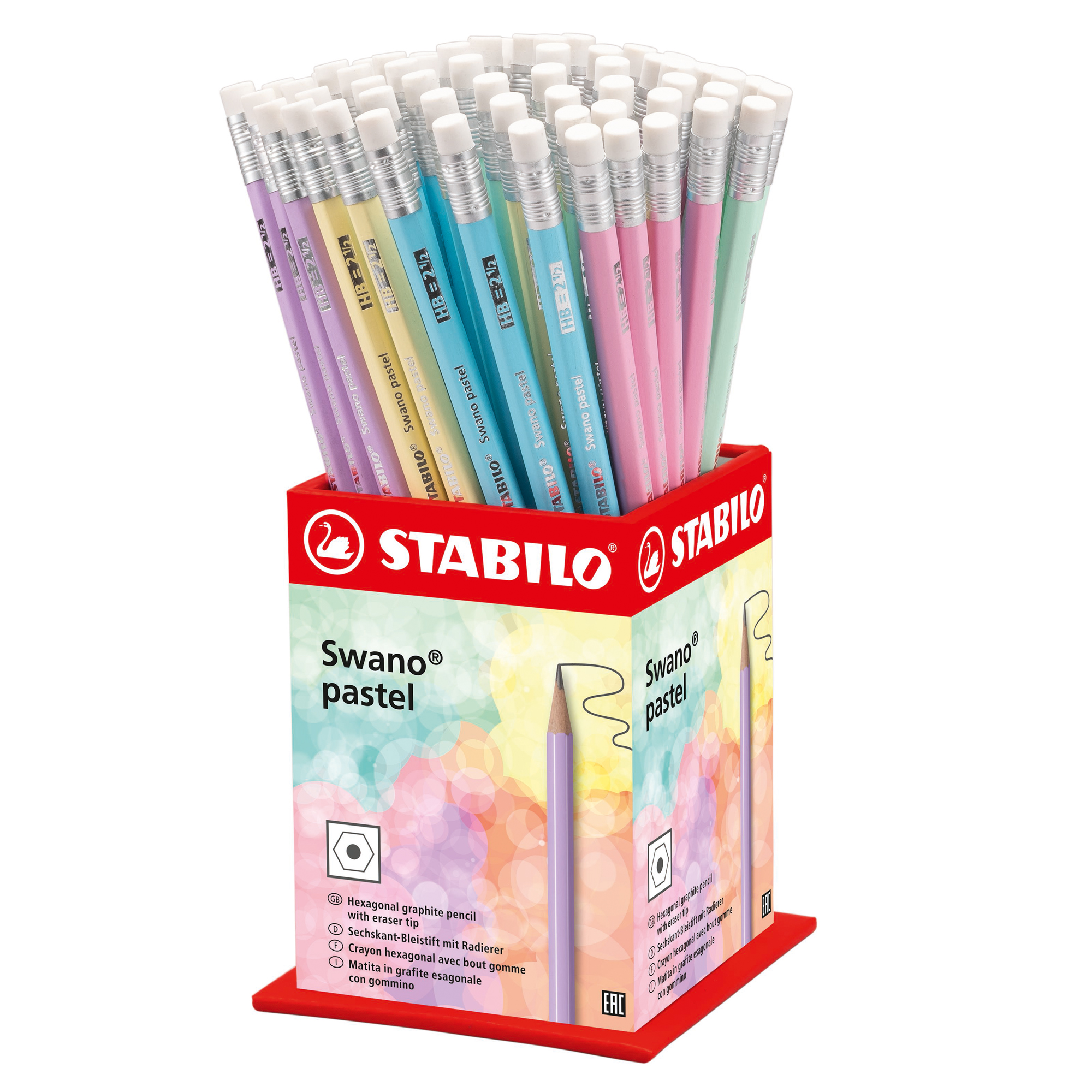ESPOSITORE DA BANCO CON 72 MATITE IN GRAFITE GRADAZIONE HB CON GOMMINO IN 6 COLORI PASTEL ASSORTITI.