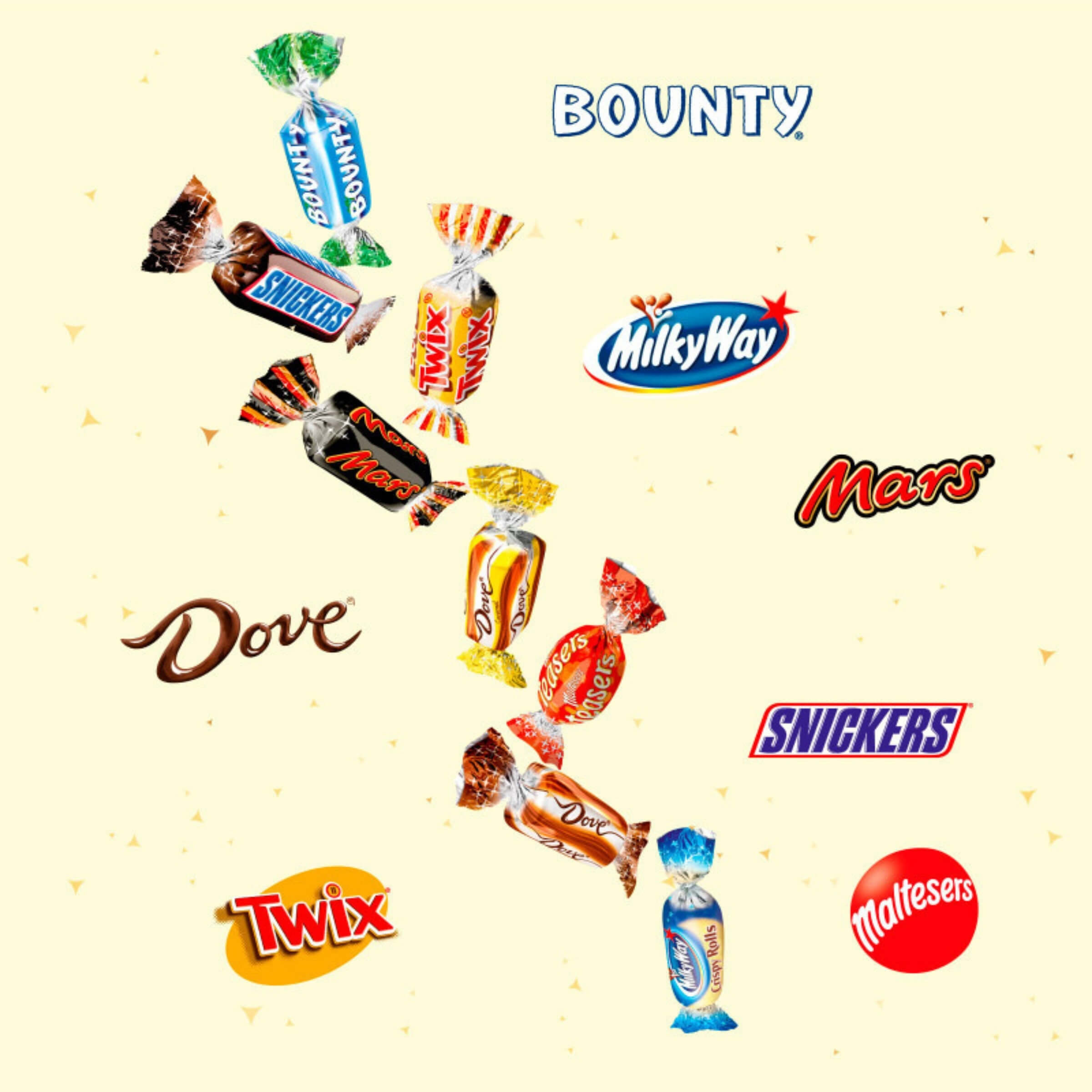 • Selezione di marchi iconici: All’interno del barattolo trovano spazio celebri marchi come Mars, Bounty, Snickers, Milky Way, Twix, Dove, Galaxy e Maltesers, ognuno con la propria personalità e un gusto unico che accontenta tutti i palati.