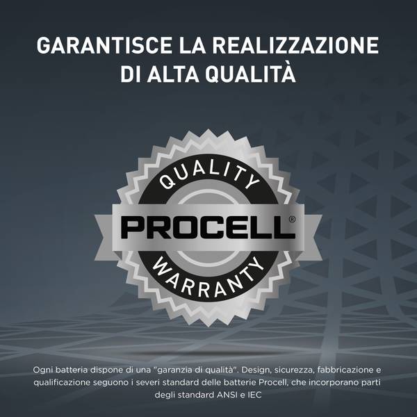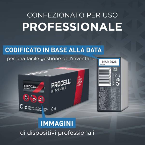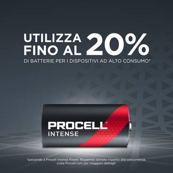 Le batterie alcaline Procell Intense C, da 1.5V, rappresentano l'innovazione nel campo delle soluzioni energetiche per dispositivi professionali ad alto consumo. Queste batterie sono state sviluppate con l'obiettivo di superare le prestazioni delle precedenti batterie alcaline C Procell, offrendo una durata significativamente maggiore in dispositivi che richiedono una grande quantità di energia o che sono soggetti a picchi di domanda energetica.Applicazioni Consigliate:• Distributore di Asciugamani di Carta: Per un'igiene e un comfort senza interruzioni.• Erogatore di Sapone: Affidabilità essenziale per mantenere elevati standard igienici.• Deodorante per Ambienti Automatico: Per ambienti sempre freschi e accoglienti.• Torcia Elettrica: Illuminazione affidabile e duratura, fondamentale in situazioni di emergenza o per lavori professionali.Caratteristiche Principali:• Risparmio Energetico: Passando alla coppia Procell – Procell Constant e Procell Intense, è possibile ottenere un risparmio fino al 20% rispetto alla concorrenza, ottimizzando così l'efficienza energetica e riducendo i costi operativi.• Efficienza Migliorata: Con le batterie Procell, la tua azienda può ridurre fino al 20% l'uso di batterie rispetto ai prodotti concorrenti, grazie alla loro maggiore durata in dispositivi ad alto consumo.• Durata Estesa: Queste batterie offrono una durata superiore rispetto alle versioni precedenti delle batterie alcaline C Procell in dispositivi ad alto consumo, significando meno sostituzioni di batterie e quindi un risparmio sui costi operativi.• Garanzia di 10 Anni in Stoccaggio: La loro lunga vita è garantita grazie a un design avanzato delle celle, che assicura un'alta qualità di realizzazione.• Qualità e Sicurezza: Ogni batteria è prodotta seguendo gli standard severi delle batterie Procell, che includono parti degli standard ANSI e IEC, garantendo affidabilità e prestazioni superiori.• Gestione Efficiente dell'Inventario: Le confezioni all'ingrosso, complete di codice individuale con data, facilitano la gestione delle scorte, assicurando che le batterie siano sempre disponibili quando necessario.• Versatilità: Progettate in collaborazione con i produttori di dispositivi professionali, le batterie alcaline Procell sono la scelta preferita per garantire prestazioni affidabili in un'ampia gamma di applicazioni.Le batterie alcaline Procell Intense C sono la soluzione ideale per garantire prestazioni eccellenti e un risparmio significativo a lungo termine per tutti i dispositivi professionali che richiedono un alto livello di energia.