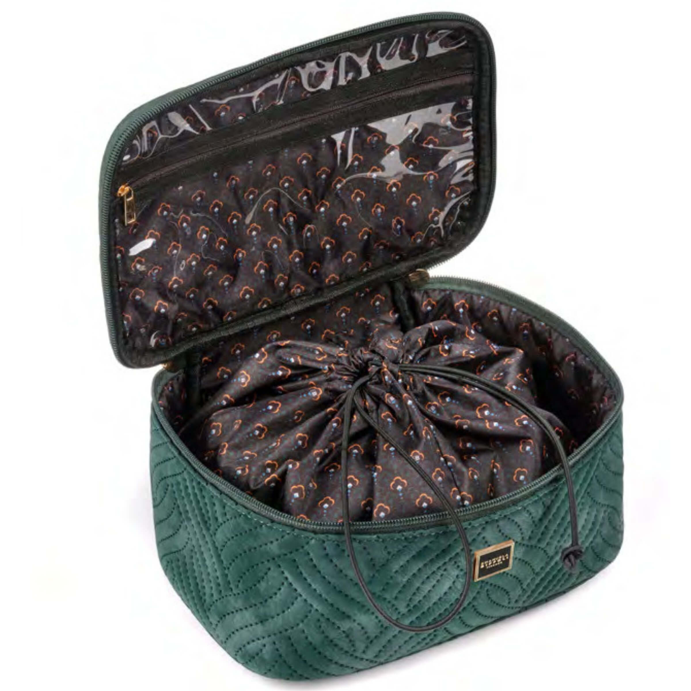 Il Beauty Case Emanuela Biffoli Onde Verde in ecopelle scamosciata rappresenta una perfetta fusione tra eleganza, praticità e design contemporaneo. Pensato per chi desidera portare con sé la propria routine di bellezza con stile, questo accessorio si distingue per la sua texture morbida e piacevole al tatto e per la tonalità verde intensa, che richiama la calma e la profondità della natura. La superficie trapuntata con motivo onde dona movimento e raffinatezza, mentre i dettagli dorati aggiungono un tocco di luce e ricercatezza. Ogni elemento è progettato per unire estetica e funzionalità, rendendo questo beauty case ideale per i viaggi, per l’uso quotidiano o come elemento d’arredo per la propria postazione beauty.• Materiale di qualità: Realizzato in ecopelle scamosciata, offre una finitura vellutata e resistente, con cuciture decorative a onde che valorizzano la struttura e donano un aspetto sofisticato e durevole nel tempo.• Chiusura doppia: Dotato di cerniera in nylon con doppio tiralampo dorato, garantisce apertura fluida e accesso comodo ai prodotti, mantenendo al contempo sicurezza e ordine.• Interni curati: La fodera interna, caratterizzata da una fantasia personalizzata esclusiva, riflette la cura artigianale del marchio e aggiunge un tocco di eleganza anche all’interno del beauty.• Organizzazione perfetta: All’interno si trovano un sacchetto in tessuto con chiusura a coulisse, ideale per custodire flaconi o accessori delicati, e una tasca piatta in PVC trasparente con cerniera per separare piccoli oggetti o cosmetici liquidi.• Dettagli raffinati: Il manico in ecopelle scamosciata tono su tono e la targhetta metallica smaltata con logo dorato Emanuela Biffoli aggiungono valore estetico e funzionale, rendendo l’accessorio facilmente trasportabile e riconoscibile.• Dimensioni: Larghezza 23 cm, Altezza 15 cm, Profondità 11 cm.Questo beauty case è la sintesi dell’eleganza quotidiana. Perfetto per chi ama la cura dei dettagli e desidera avere sempre tutto in ordine, racchiude l’essenza del design Made in Italy con equilibrio e raffinatezza. La combinazione di colori, materiali e finiture lo rende un oggetto prezioso ma pratico, ideale per accompagnare ogni spostamento con stile e funzionalità.