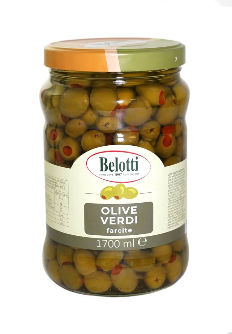 Olive verdi snocciolate con ripieno di peperoni, un esplosione di gusto! Ottime come stuzzichino durante un aperitivo. Peso Netto: 1600 gIngredienti: olive (58%), olio di semi di girasole, pasta di peperoni, sale. Antiossidante: acido L-ascorbico. Correttore di acidità: acido citrico.Dopo l'apertura conservare in frigorifero.DICHIARAZIONE NUTRIZIONALE per 100 g di prodotto sgocciolato:Energia: 664 kJ/162 kcalGrassi: 17,0 g di cui acidi grassi saturi 3,0 gCarboidrati: 0 g di cui zuccheri 0 gFibre: 2,6 gProteine: 1,0 gSale: 1,3 g