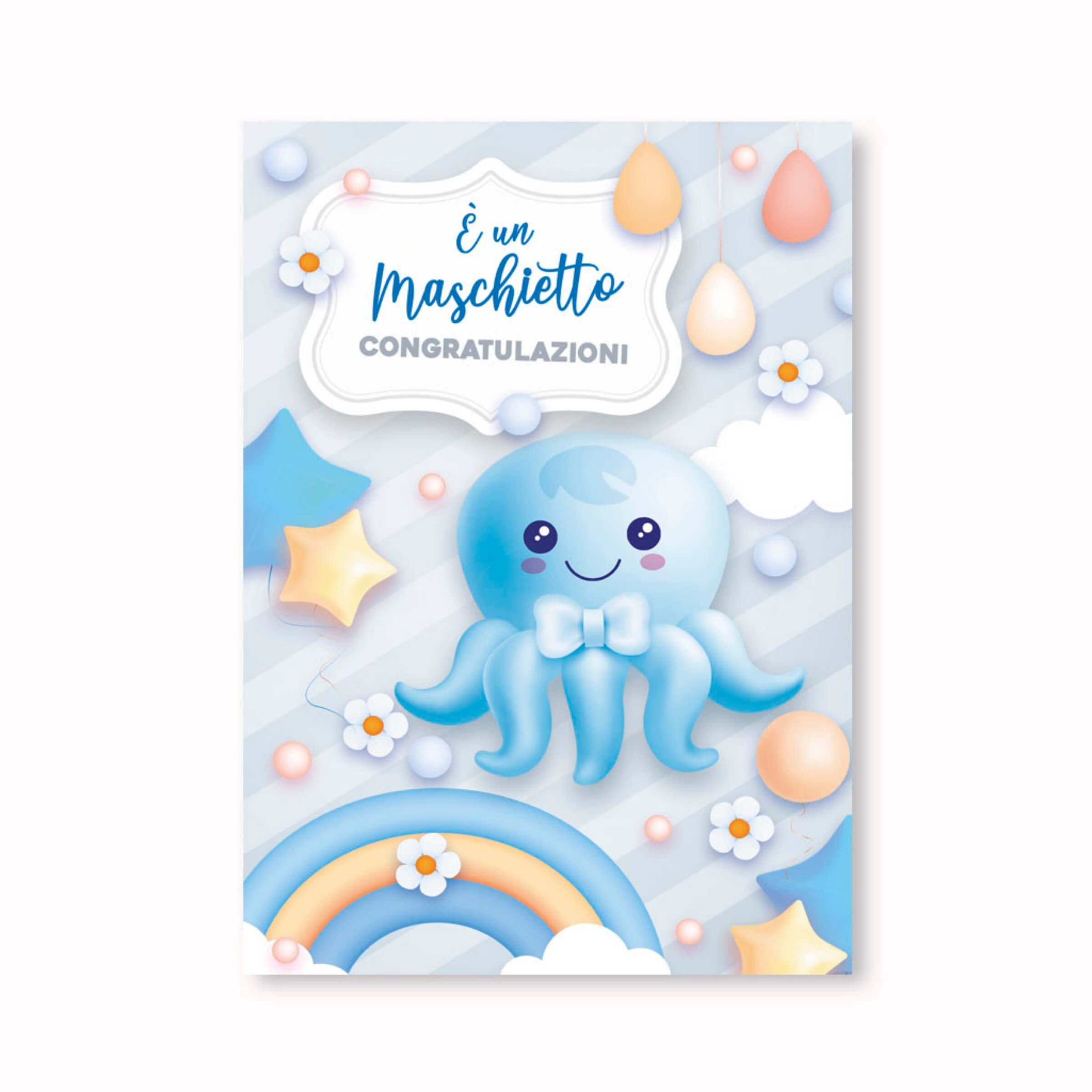 La nascita di un bambino è un momento pieno di emozioni, sorrisi e tenerezza. Il biglietto augurale Nascita Azzurro Pop Up è pensato per accompagnare questo evento con un messaggio di felicità e affetto. L’illustrazione dolce e colorata raffigura un simpatico polipo azzurro con papillon, circondato da stelle, nuvole e arcobaleni che creano un’atmosfera serena e gioiosa. Al suo interno, l’effetto tridimensionale pop up regala un sorprendente gioco di profondità, trasformando un semplice augurio in un gesto che rimane impresso nel cuore. Perfetto per accompagnare un dono o per essere conservato come ricordo di un giorno speciale.