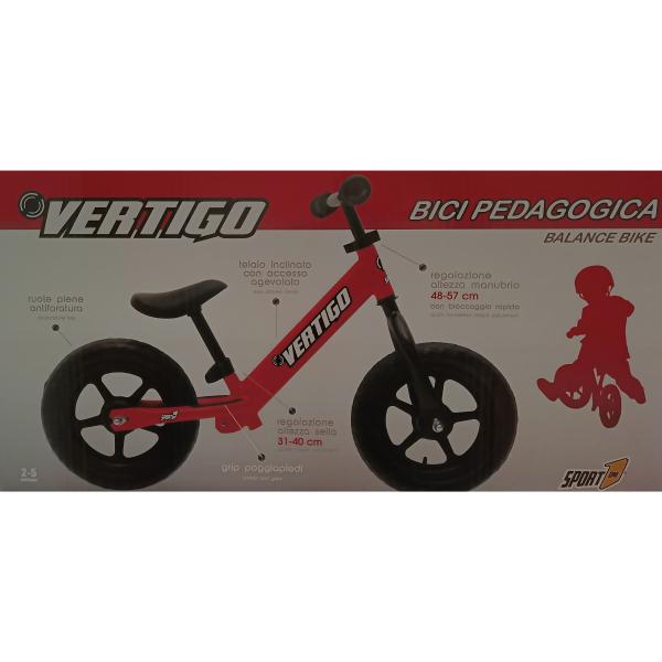 La Bicicletta Pedagogica Vertigo è l'ideale per i bambini che iniziano a prendere confidenza con il mondo delle due ruote. Progettata per sviluppare equilibrio e coordinazione, questa bici senza pedali offre un'esperienza sicura e divertente per i più piccoli.• Regolazione personalizzata: La bicicletta è dotata di un manubrio regolabile in altezza da 50 a 60 cm, con un sistema di bloccaggio rapido per un aggiustamento facile e veloce. Anche la sella è regolabile in altezza, da 34 a 44 cm, per adattarsi alla crescita del bambino e garantire sempre una posizione confortevole.• Telaio inclinato con accesso agevolato: Il telaio è inclinato per permettere un accesso facile e sicuro, facilitando la salita e la discesa dal veicolo. Questa caratteristica rende la bicicletta particolarmente adatta ai bambini più piccoli che stanno imparando a mantenere l'equilibrio.• Ruote piene antiforatura: La bicicletta è equipaggiata con ruote piene antiforatura, che offrono una guida sicura su qualsiasi superficie, senza il rischio di forature. Questo tipo di ruote non richiede manutenzione, assicurando una lunga durata e resistenza nel tempo.• Grip poggiapiedi: La bicicletta è dotata di poggiapiedi con grip, che garantiscono stabilità e sicurezza durante la corsa, permettendo al bambino di posizionare comodamente i piedi una volta raggiunta una certa velocità.• Design accattivante: Con il suo vivace colore rosso e il design sportivo, questa bicicletta attirerà sicuramente l'attenzione dei bambini, invogliandoli a giocare all'aperto e a esplorare il mondo su due ruote.La Bicicletta Pedagogica Senza Pedali Vertigo è lo strumento perfetto per accompagnare i bambini nei loro primi passi verso l'indipendenza su due ruote, combinando sicurezza, praticità e divertimento.