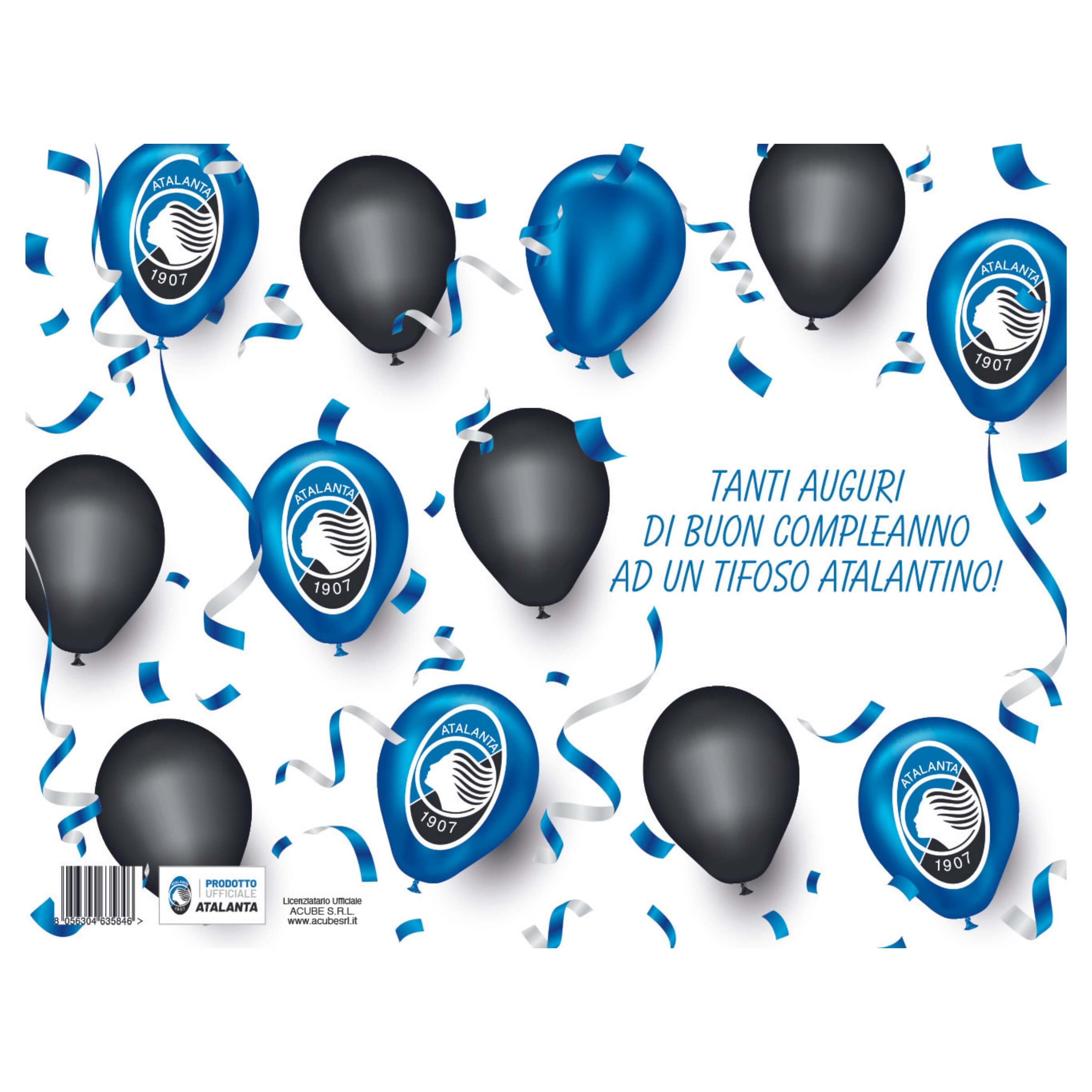 Festeggia il compleanno di un vero tifoso atalantino con il Biglietto Ufficiale Atalanta Palloncini Tanti Auguri. Questo biglietto, decorato con palloncini neri e blu e il logo dell'Atalanta, è il modo perfetto per esprimere i tuoi auguri in modo speciale e personalizzato.