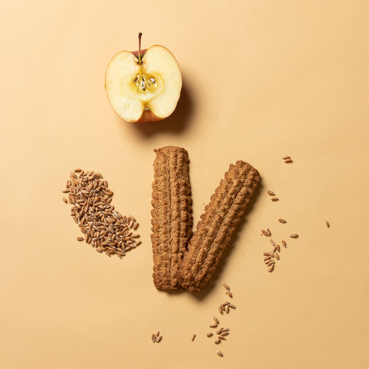 Il nostro obiettivo è darvi un biscotto sano e nutriente. Il farro infatti, essendo integrale e ricco di fibra, trattiene molto nutrimento e rilascia gli zuccheri molto più lentamente di un normale frollino. Ne deriva un biscotto molto gustoso, che esalta il sapore della polpa di mela.