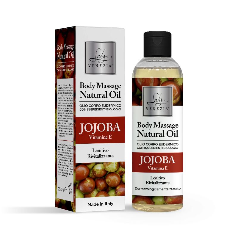 Olio Corpo Eudermico per massaggi con ingredienti biologici LENITIVO E RIVITALIZZANTE Eudermici, tonificanti, rilassanti, rivitalizzanti, decontratturanti: gli Oli da Massaggio Lady Venezia sono un vero e proprio trattamento di bellezza che coniuga natura, salute e sensualità. Grazie infatti ai loro componenti di origine naturale e alle fragranze seducenti, sono dei veri e propri concentrati di benessere che accarezzano i sensi e donano sollievo all’organismo. La loro formulazione delicata li rende inoltre adatti anche alle zone più sensibili. Niente di meglio per prendersi cura di sé regalandosi un momento di puro relax! Il Body Massage Natural Oil Jojoba sfrutta le proprietà dell’Olio di Jojoba, lipide vegetale ricco di vitamina E, vitamine del complesso B e minerali quali zinco, rame e iodio. Grazie alla sua formulazione aiuta a rivitalizzare e rigenerare la pelle, con un effetto lenitivo in caso di irritazioni. Risultato: la pelle è idratata, liscia e setosa. Inoltre la sua azione antiossidante previene l’invecchiamento precoce dell’epidermide e aiuta a distendere le rughe. Modo d’uso: applicare l'Olio direttamente sulla pelle di tutto il corpo, asciutta o umida, e massaggiare fino a completo assorbimento. In alternativa, è possibile utilizzarlo anche sotto la doccia. Ideale anche per massaggi sensuali. Risultato: la pelle è rinvigorita, morbida e luminosa. Il mix di sfumature olfattive inoltre favorisce un effetto aromaterapico, aiutando a distendere le tensioni, non solo fisiche ma anche emotive e mentali.