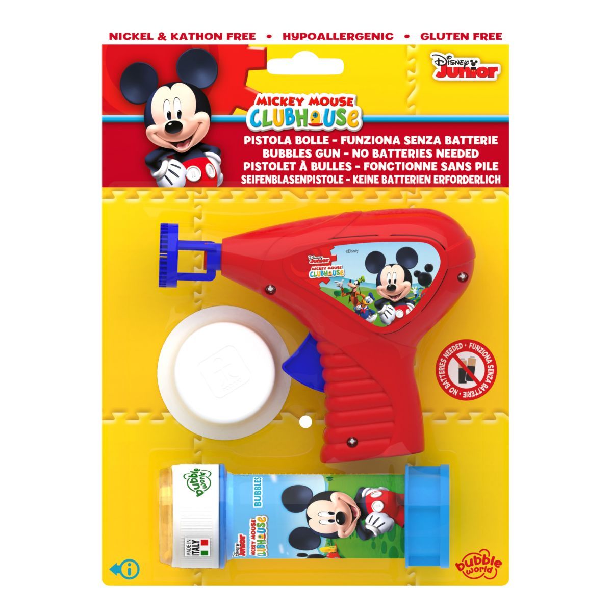 Confezione in blister con pistola piccola meccanica che non richiede batterie, bolla di sapone 60ml Bubble World Disney Mickey Mouse e vaschetta da usare come contenitore per il liquido.