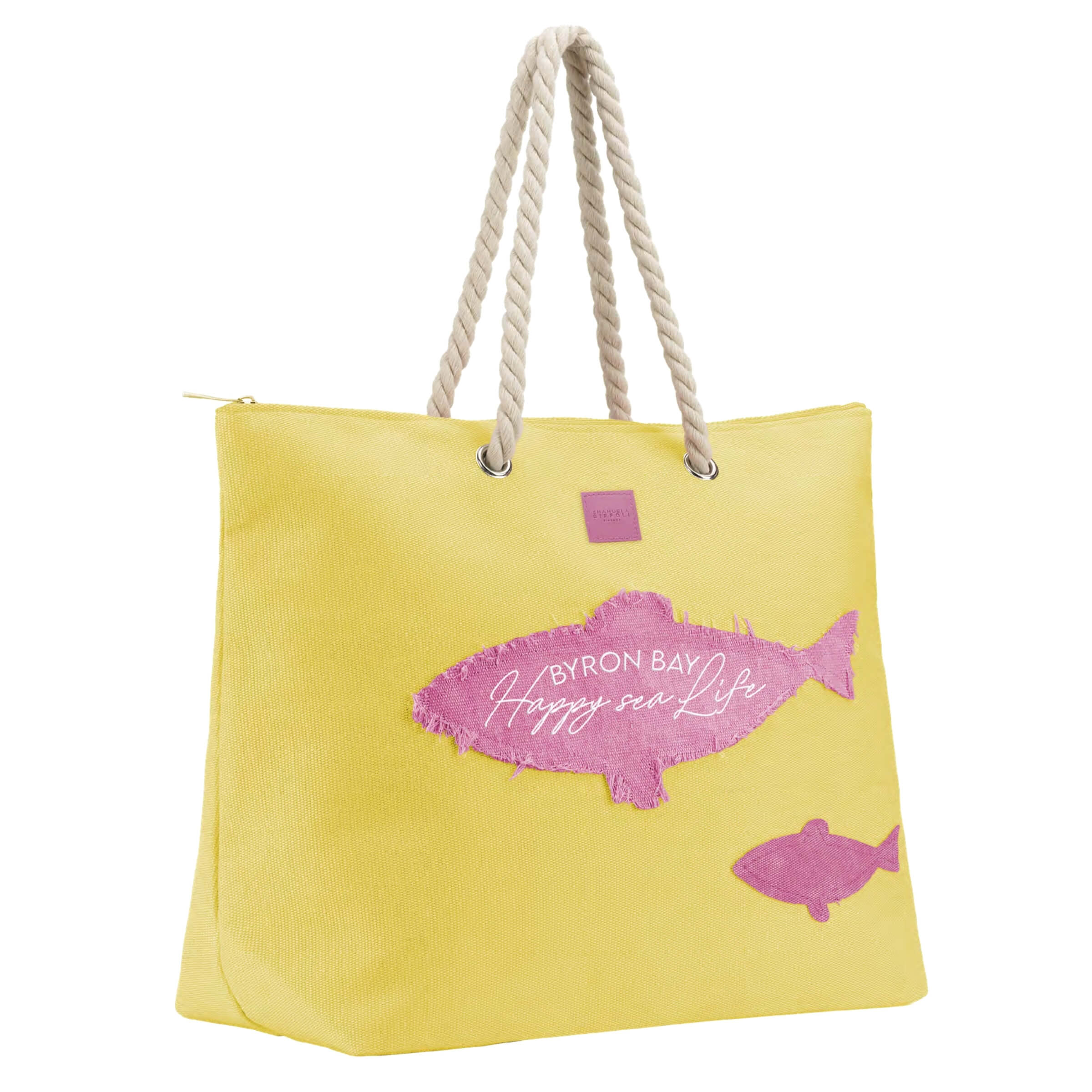 Soleggiata e vivace, la borsa mare in canvas gialla con applicazioni rosa porta con sé tutta l’energia dell’estate. Un accessorio pensato per chi ama vivere il tempo libero con leggerezza, stile e un tocco creativo. Perfetta per giornate in spiaggia, pomeriggi in piscina o passeggiate estive, unisce funzionalità e design in un connubio armonioso.• Motivo decorativo marino: Le applicazioni frontali a forma di pesci, in tessuto rosa sfrangiato, evocano la libertà del mare e donano alla borsa uno stile fresco e originale, perfetto per chi ama distinguersi con eleganza.• Tessuti resistenti e piacevoli: Realizzata in canvas robusto e leggero, con fodera interna in cotone di colore abbinato, questa borsa è progettata per accompagnarti in ogni momento estivo, offrendo resistenza e comfort.• Manici in corda intrecciata: I manici in corda nautica spessa garantiscono una presa stabile e comoda anche a pieno carico, aggiungendo un dettaglio naturale e autentico allo stile complessivo della borsa.• Chiusura pratica con zip: La chiusura superiore con cerniera e tiralampo dorato assicura la protezione del contenuto, mantenendolo al sicuro da sabbia, vento e schizzi.• Tasca interna comoda: All’interno della borsa si trova una tasca piatta utile per organizzare piccoli oggetti come chiavi, telefono o accessori personali, mantenendo tutto in ordine e facilmente accessibile.• Capiente e stabile: Le ampie dimensioni consentono di trasportare comodamente tutto l’occorrente per una giornata all’aperto, dai teli mare ai cambi d’abito, senza rinunciare alla leggerezza.La borsa mare in canvas gialla con pesci rosa è una combinazione perfetta di praticità e personalità. Colorata, solare e versatile, si adatta con naturalezza a ogni occasione estiva, regalando stile e funzionalità in ogni momento della giornata.Materiali: Canvas, cotoneChiusura: Zip superiore con tiralampo doratoDotazione: 1 borsaDimensioni borsa: 50 x 41 x 20 cmColore: Giallo con applicazioni rosa
