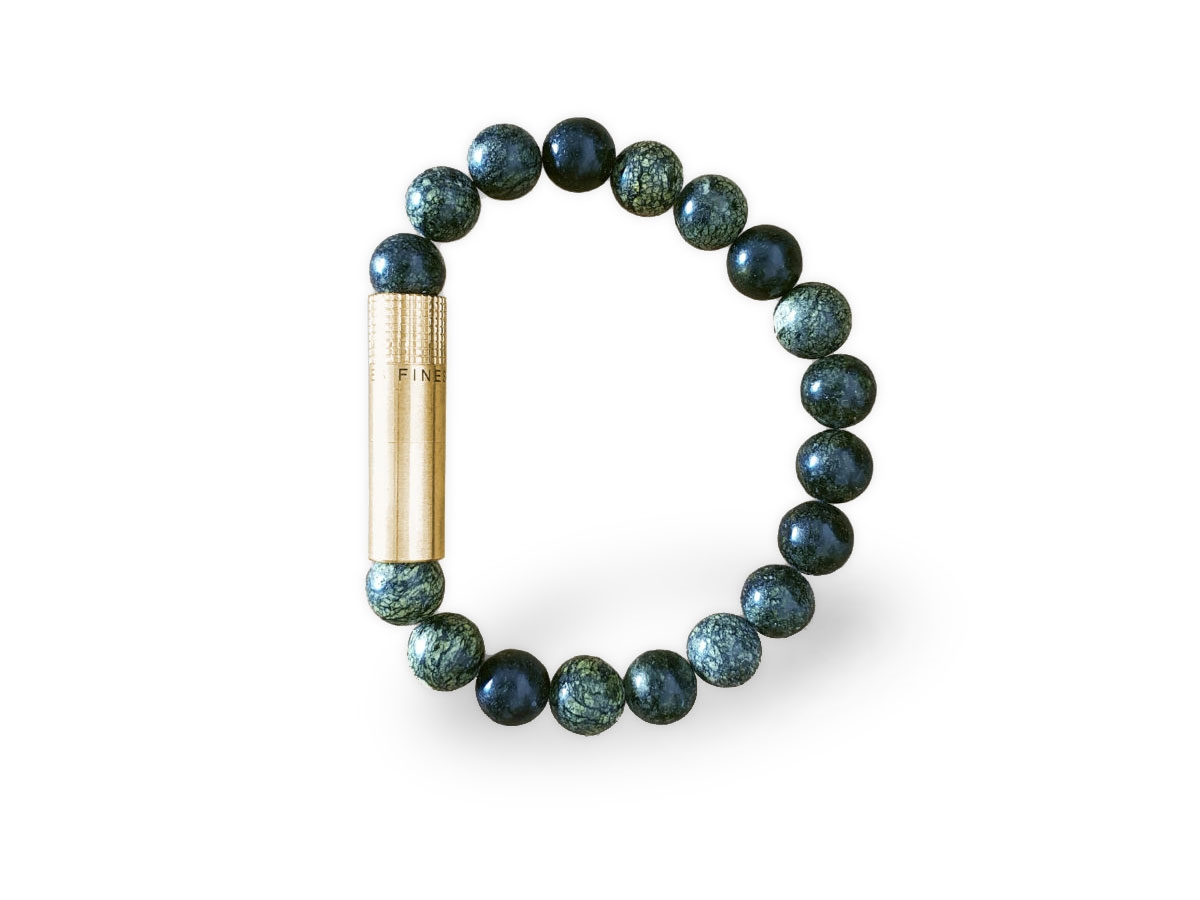 Il punch per sigari nascosto nel bracciale è disponibile in stainless steel o in ottone (brass), mentre le perline da 10 mm variano in 8 diversi tipi di pietre semipreziose.