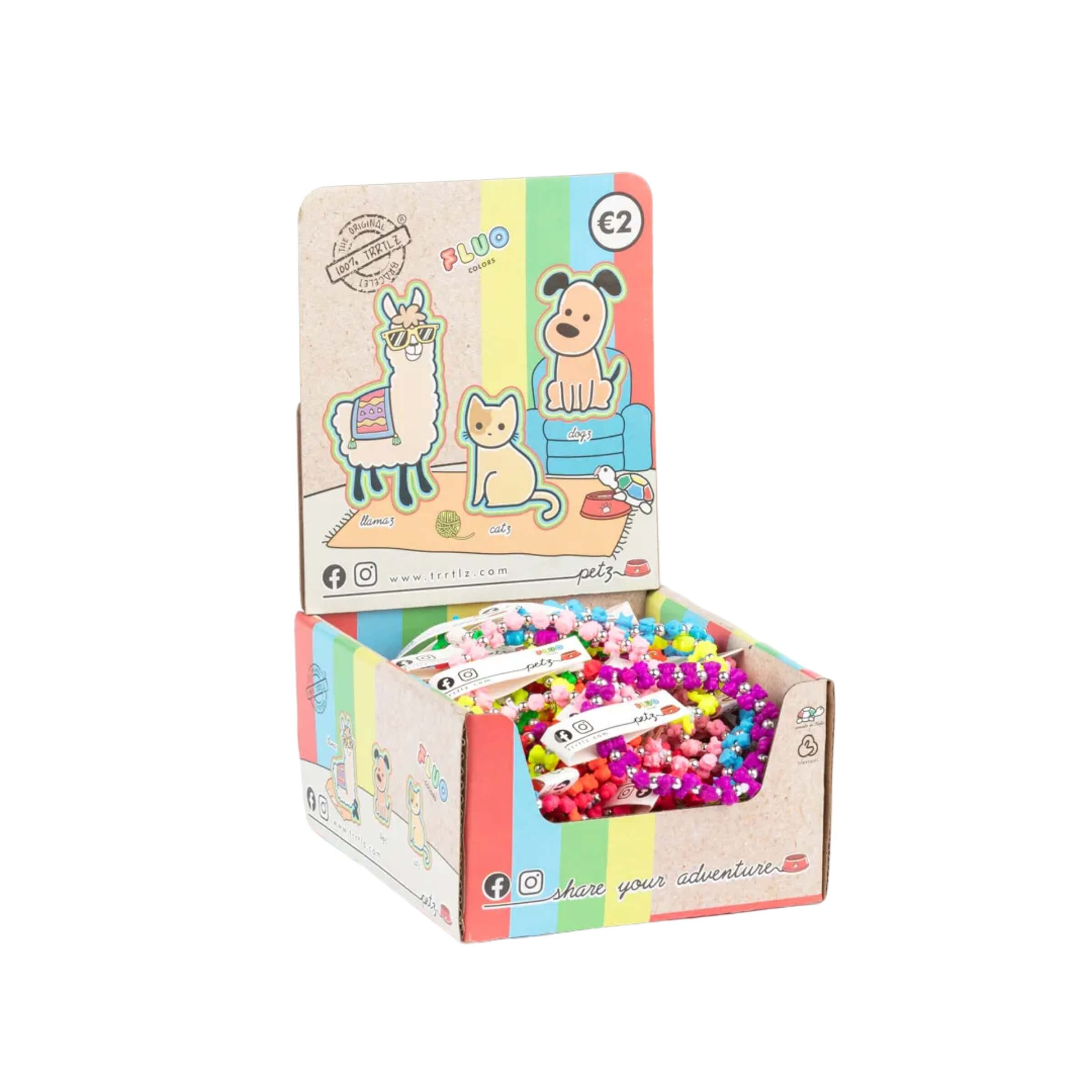 Benvenuti nel mondo di Petz!Siamo lieti di presentarvi la confezione di braccialetti Petz, un mix di 50 adorabili braccialetti a forma di cagnolino, gattino e lama, in una varietà di vivaci colori fluo!I braccialetti Petz non solo aggiungono un tocco di stile al tuo look, ma anche un tocco di dolcezza e divertimento. Sia che tu sia un amante dei cani, dei gatti o delle alpacas, questi braccialetti sono la scelta perfetta per esprimere la tua passione per gli animali.La confezione dei Petz è stata progettata con estrema cura, garantendo un design accattivante che cattura l'attenzione dei clienti. Questo rende i Petz un prodotto da banco veloce e perfetto, ideale per essere posizionato facilmente e adatto alla vendita in qualsiasi attività. Con i loro colori brillanti e i simpatici disegni, i braccialetti Petz sicuramente attireranno l'attenzione dei clienti di tutte le età.I braccialetti Petz sono adatti sia per uomini che per donne, e possono essere indossati da chiunque a partire dai 4 anni in su. La taglia dei braccialetti è di 20-21 cm di circonferenza del polso, garantendo una vestibilità comoda per la maggior parte delle persone.Sono utilizzati materiali di alta qualità per i braccialetti Petz. Sono realizzati in resina acrilica parzialmente riciclata, che li rende eco-friendly, permettendoti di sfoggiare un look alla moda senza compromettere l'ambiente.I Petz sono molto più di semplici braccialetti. Sono un modo per mostrare la tua personalità e il tuo amore per gli animali, con un tocco di originalità e stile. Aggiungi un tocco di allegria e colore al tuo polso con i braccialetti Petz!Non aspettare oltre, prendi la tua confezione di braccialetti Petz oggi stesso e inizia a creare il tuo zoo personale di animali da polso!