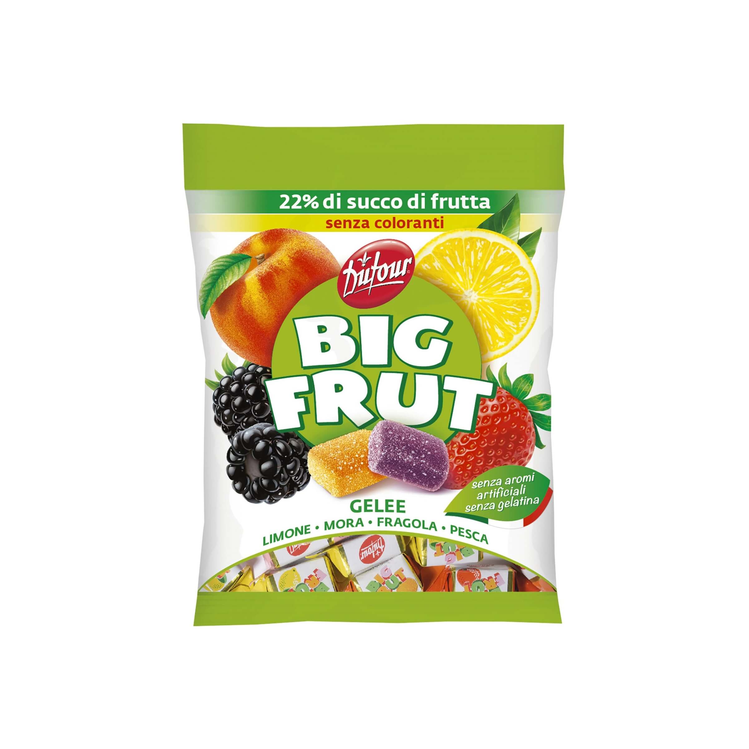 Un viaggio nei sapori solari del Mediterraneo racchiuso in una gelatina morbida e profumata: le Big Frut Gelee Frutti Mediterranei di Dufour sono un omaggio alla dolcezza e freschezza della frutta più amata delle terre calde. Fragola, limone, mora e pesca si incontrano in un equilibrio aromatico che restituisce tutta la vivacità dei frutti estivi, esaltata da una ricetta storica che da decenni accompagna i momenti di piacere quotidiano. L’alto contenuto di succhi di frutta e l’assenza di coloranti artificiali rendono ogni gelèe non solo gustosa, ma anche fedele al sapore autentico della natura.• Contenuto di frutta elevato: La ricetta contiene il 22 percento di succhi di frutta da concentrato, con fragola, limone, mora e pesca, per offrire una varietà aromatica piena e naturale.• Solo aromi naturali: Le gelatine sono aromatizzate esclusivamente con ingredienti di origine naturale, in grado di riprodurre fedelmente il profumo e il gusto dei frutti utilizzati.• Texture morbida e compatta: La pectina come gelificante dona alle caramelle una consistenza perfetta, che unisce morbidezza a una masticazione piacevole e persistente.• Ingredienti semplici e bilanciati: Zucchero, sciroppo di glucosio-fruttosio, sciroppo di glucosio, acidificante (acido citrico), correttore di acidità (citrato di potassio) e aromi naturali compongono una formulazione che esalta la frutta senza coprirla.• Profilo nutrizionale leggero: Ogni 100 grammi apportano 321 kcal, con 79.4 grammi di carboidrati, di cui 68.3 sono zuccheri, zero grassi, 0.1 grammi di proteine e 0.06 grammi di sale.La busta da 90 grammi rappresenta una piccola riserva di gusto mediterraneo, perfetta da condividere o gustare nei momenti di relax. Le Big Frut Gelee Frutti Mediterranei si distinguono per la loro naturale intensità, per la qualità costante e per un profilo aromatico che sa di sole, di estate e di semplicità autentica.