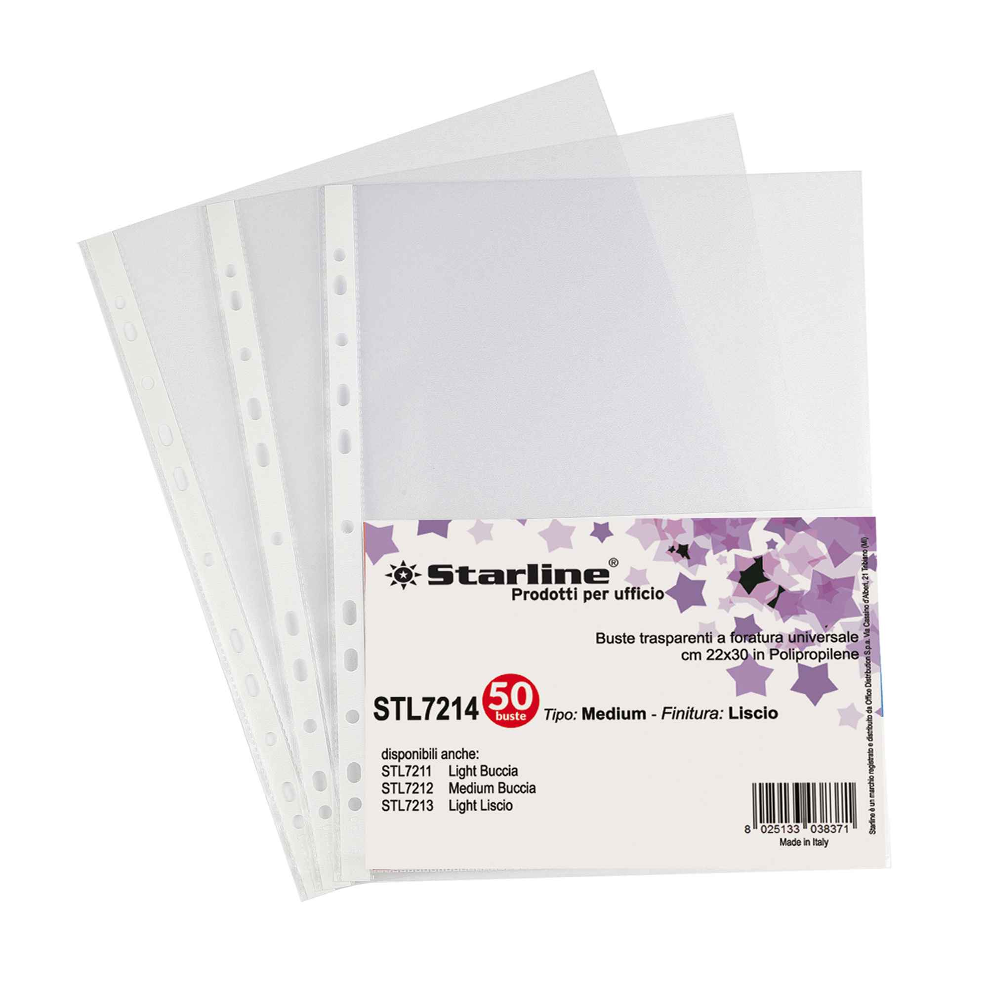 BUSTE STARLINE CON FORATURA UNIVERSALE RINFORZATA. REALIZZATE IN POLIPROPILENE TRASPARENTE FINITURA LISCIO. FORMATO UTILE 22X30CM.